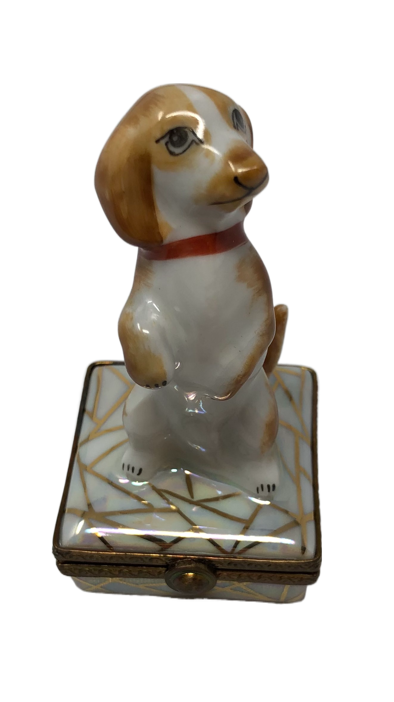Beguiling Basset: Limoges Box in the Shape of a Begal with a Red Collar