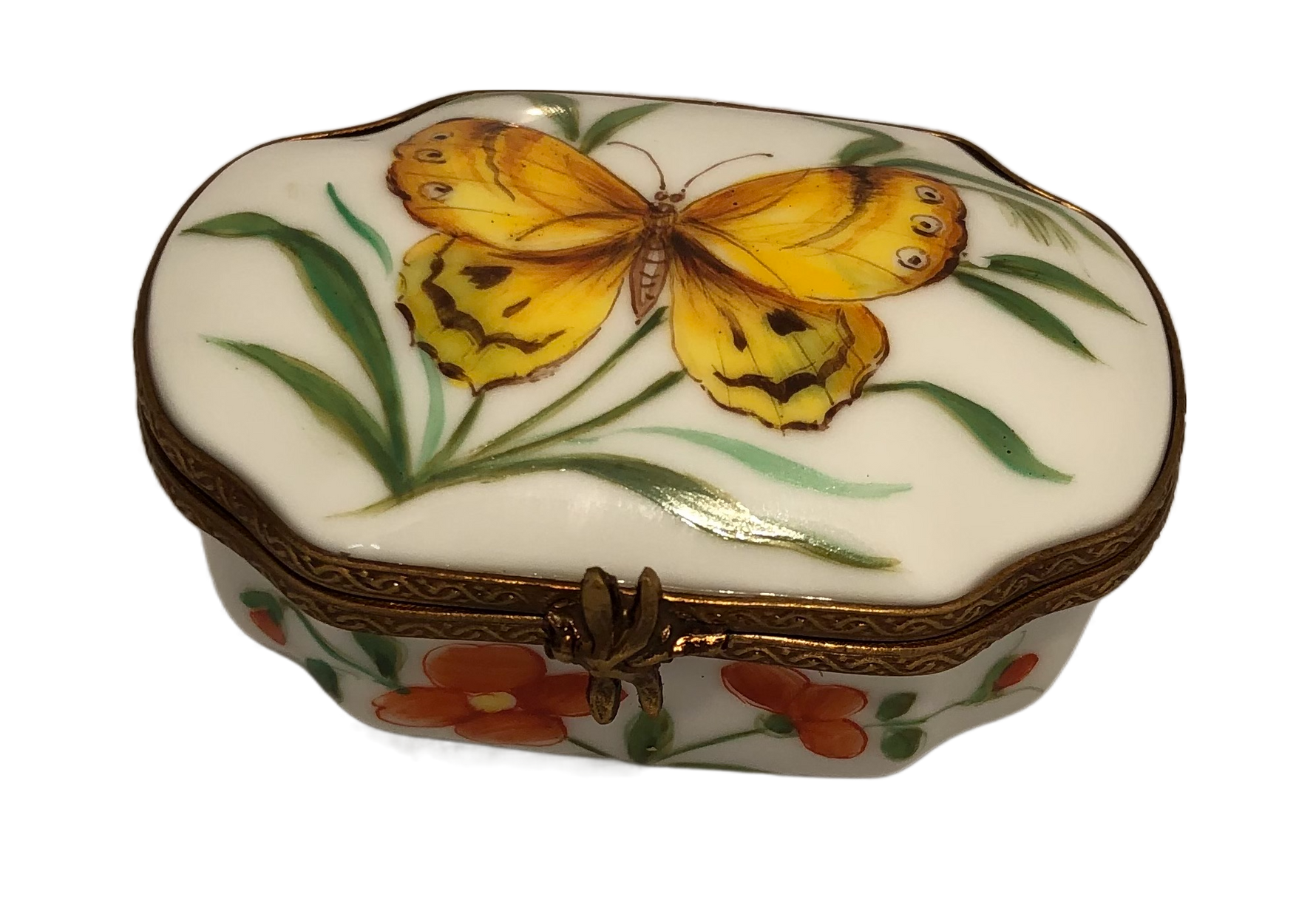 Atop the box, a magnificent yellow butterfly takes center stage, its wings outstretched in delicate flight. Behind the butterfly, lush green leaves create a harmonious backdrop, adding depth and natural elegance to the scene. The vibrant colors and intricate details of the flowers, butterfly, and leaves make this Limoges Box a true work of art.