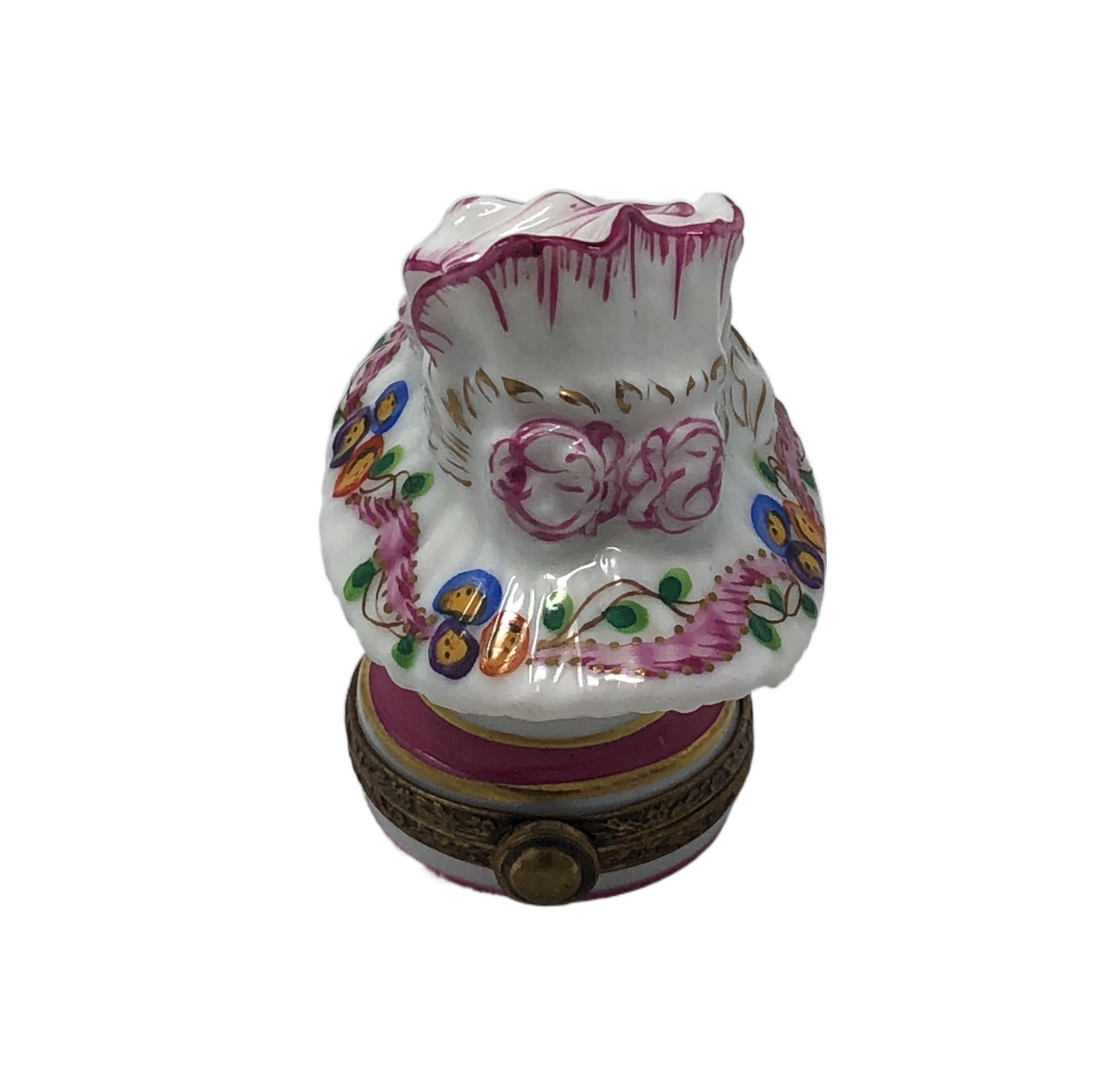 Embrace the enchanting beauty of our Hand-Painted Limoges Box, shaped like a delicate white and pink vase adorned with a dainty bow and vibrant flowers. This exquisite piece is a true testament to the artistry and craftsmanship that Limoges porcelain is renowned for.