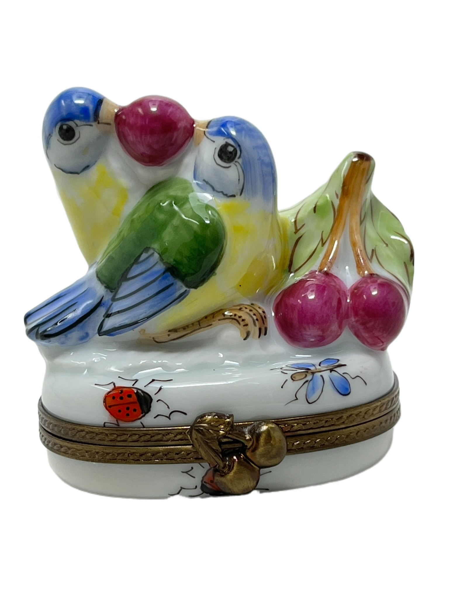 Cherry Rivalry: Limoges Box - Blue and Yellow Birds in Battle