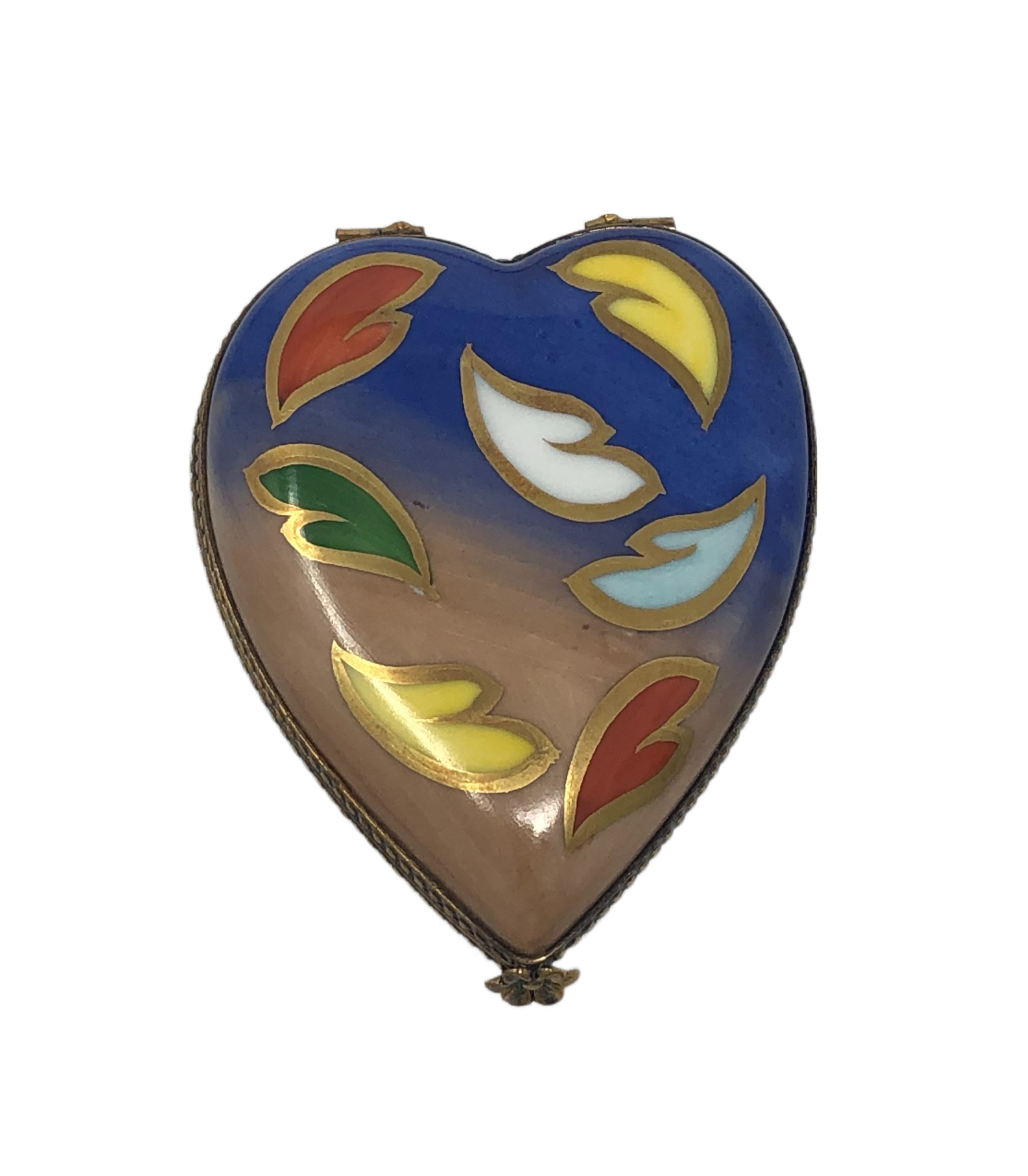Embrace the beauty of love and nature with our Colorful Feathered Heart Limoges Box. This exquisite heart-shaped box features a captivating blend of blue and khaki hues that create a mesmerizing gradient effect. Adorning the surface are seven intricately painted feathers in a vibrant array of colors, adding a touch of whimsy and charm to the design. Lift the lid to reveal a secret compartment, perfect for storing small treasures or heartfelt messages. Handcrafted with meticulous attention to detail, this Limoges box is a true testament to craftsmanship and artistry. Celebrate love and adorn your space with this enchanting keepsake that combines elegance and natural beauty.