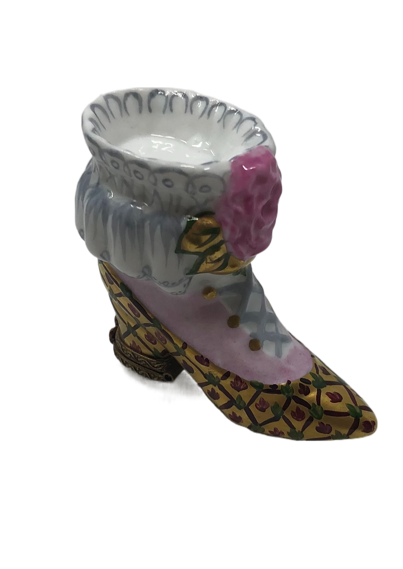 Step into a world of elegance and charm with our Golden-Footed Women's Shoe Limoges Box. Crafted in the shape of a stunning woman's shoe, this exquisite Limoges Box captures the essence of femininity and style. The shoe features intricate details, including golden feet that add a touch of luxury, and a delicate white frill adorning the opening. Atop the laces, a dainty pink flower blossoms, lending a subtle hint of romance. The hinged opening reveals a hidden compartment, perfect for storing tiny treasures or precious keepsakes. Meticulously hand-painted, this Limoges Box showcases the artistry and craftsmanship for which Limoges porcelain is renowned. Display it as a centerpiece on a vanity or shelf, or gift it to someone who appreciates the finer things in life. Embrace the beauty and allure of our Golden-Footed Women's Shoe Limoges Box, a symbol of timeless elegance and grace.