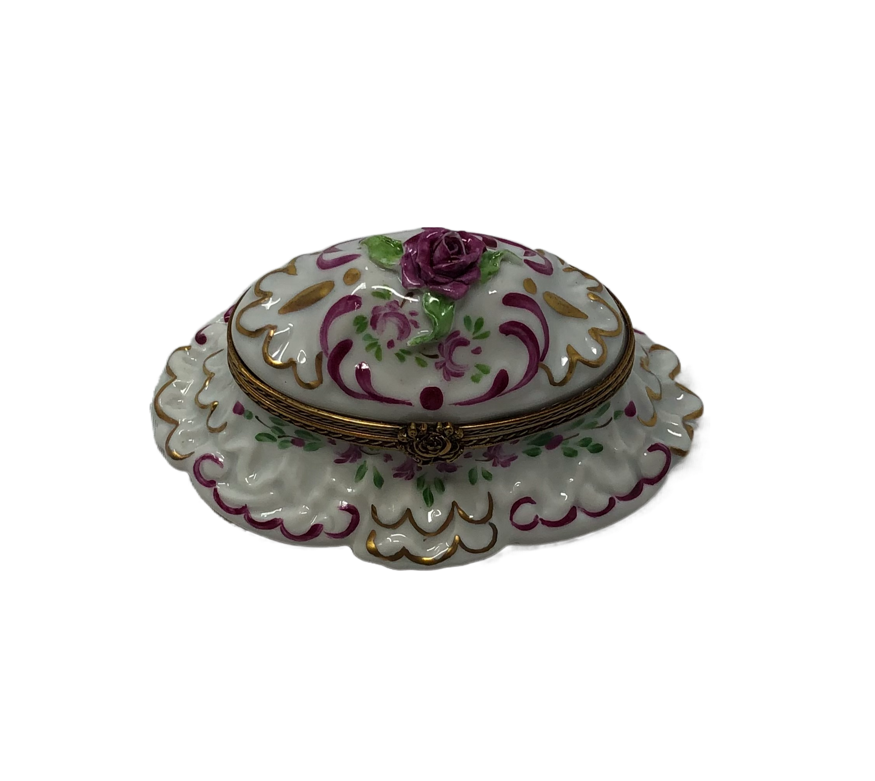 The combination of the pristine white porcelain and the shimmering gold and purple accents creates a captivating visual contrast. The intricate details and lifelike textures make this Limoges box a true work of art. Lift the lid to reveal a hidden compartment, perfect for storing small trinkets or precious keepsakes.