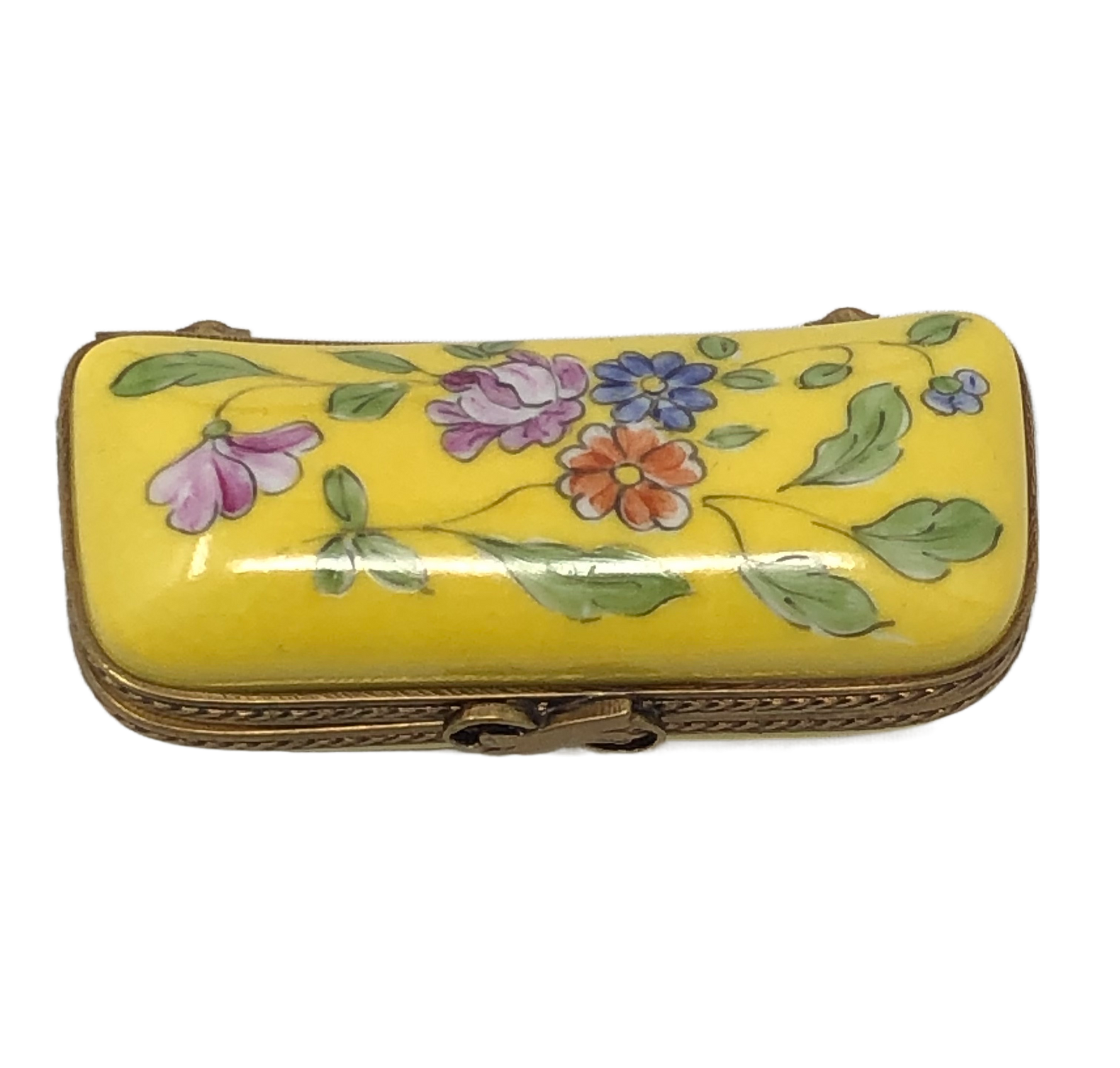 Indulge in the beauty of nature with our Enchanting Blooms Limoges Box. This exquisite rectangular box features a vibrant yellow base adorned with a mesmerizing array of pink, purple, orange, and blue flowers. Each petal is delicately hand-painted, capturing the essence of a blossoming garden. Lift the lid to reveal a hidden compartment, perfect for storing your treasured trinkets. With its charming design and meticulous craftsmanship, our Enchanting Blooms Limoges Box is a captivating addition to any collection or a thoughtful gift for flower enthusiasts. Embrace the joy and vibrancy of nature with this enchanting piece.