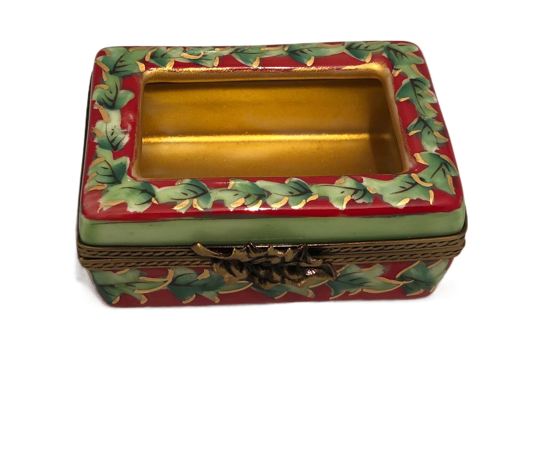 Crafted with meticulous artistry, this Limoges keepsake box is a testament to the timeless allure of nature's wonders. The rich red hue serves as a captivating backdrop, while the intricate green vines add a touch of delicacy and freshness. The rectangular shape of the box lends itself to versatility, making it a perfect home for your cherished trinkets, small treasures, or special mementos.