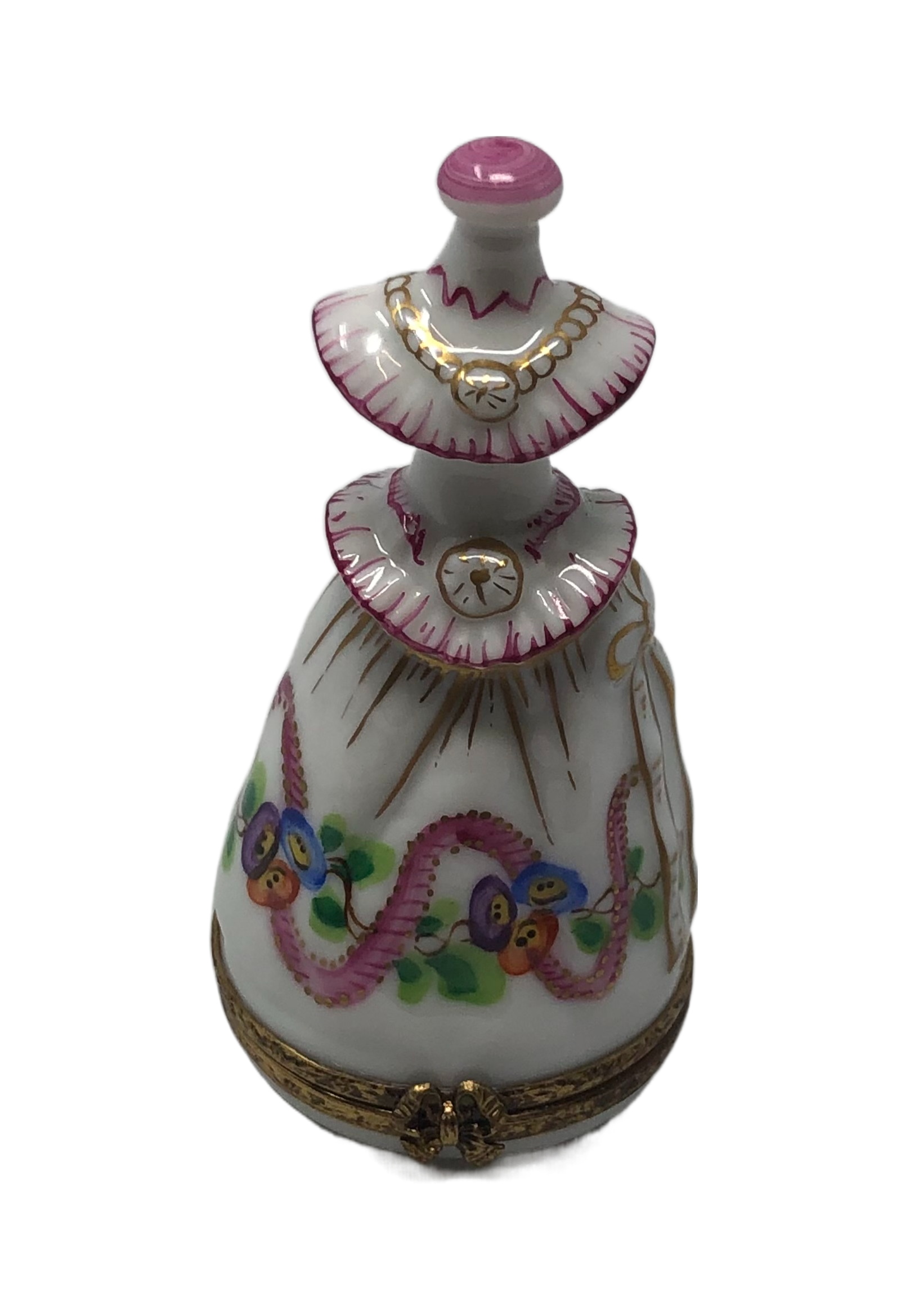 Introducing our exquisite Hand-Painted Limoges Dress Box, a stunning representation of beauty and grace. This exquisite piece features a beautiful white and pink dress, cascading in a floor-length silhouette. Adorned with intricate hand-painted floral patterns, delicate blossoms grace the bottom of the dress, adding an enchanting touch to its design. The dress is accentuated with a golden necklace, highlighting its elegance and sophistication. Meticulously crafted by skilled artisans, each brushstroke captures the intricacy of the floral details, creating a truly mesmerizing work of art. The hinged opening reveals a hidden compartment inside, perfect for storing tiny treasures or cherished keepsakes. Whether displayed as a centerpiece or added to your Limoges collection, this Hand-Painted Limoges Dress Box is a true testament to artistry and makes a meaningful gift for collectors and fashion enthusiasts alike. Embrace the beauty of this enchanting dress and elevate your decor with our Floral Elegance Limoges Dress Box.