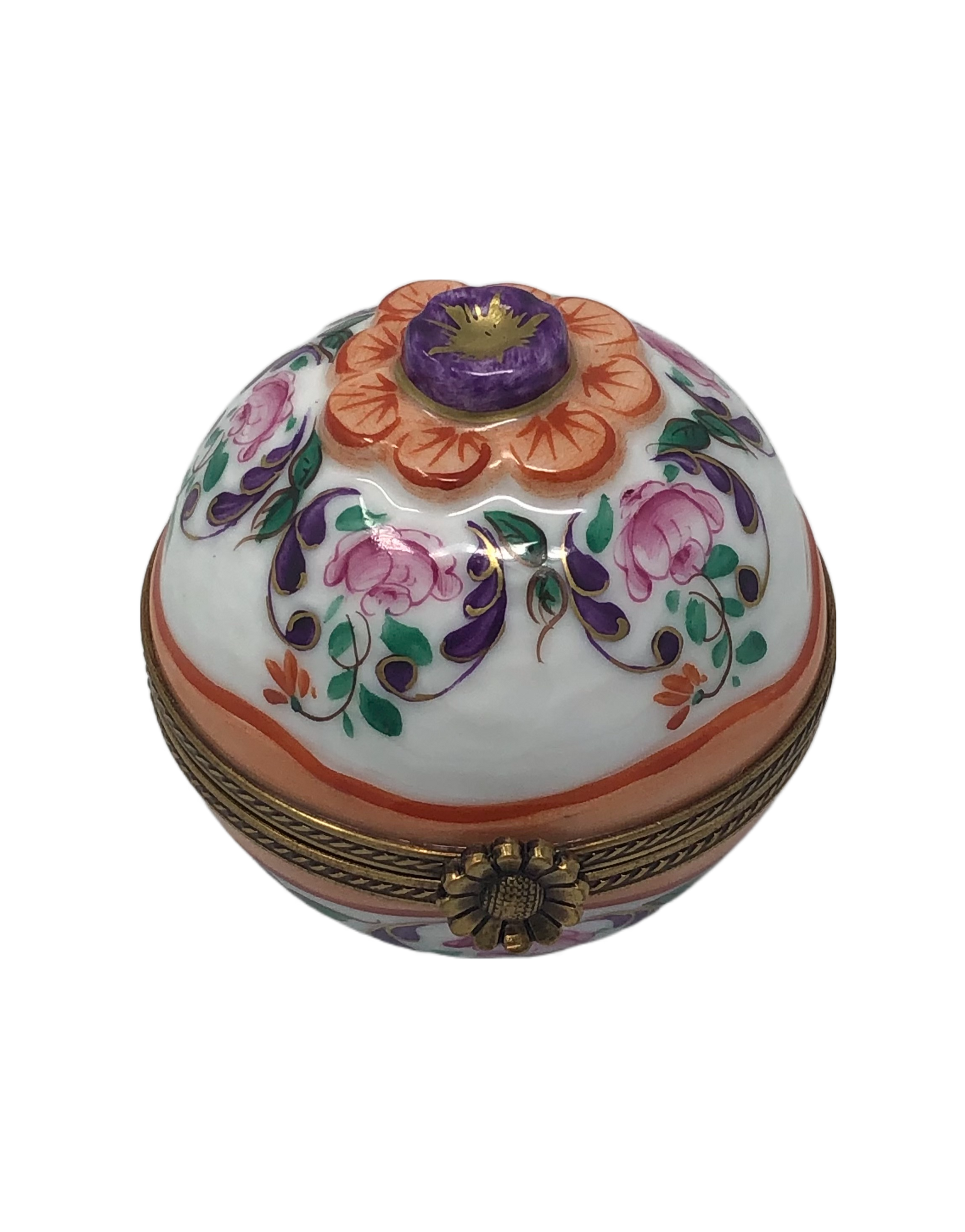 Discover the enchanting beauty of our exquisite Limoges Box in the shape of a spherical treasure, adorned with delicate hand-painted pink flowers and a striking purple flower on top. The meticulous attention to detail and vibrant colors make this box a true work of art.