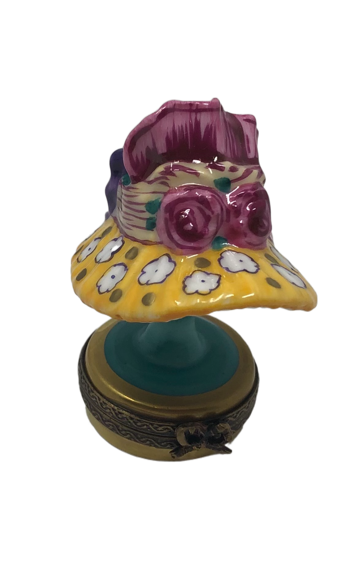 Elevate your collection with our exquisite Hat on Pedestal Limoges Box. Crafted with meticulous attention to detail, this stunning piece features a charming hat shape resting on a golden pedestal. The brim of the hat is adorned with a vibrant yellow hue, while the top is beautifully adorned with delicate pink flowers, adding a touch of elegance and femininity. The intricate hand-painted details capture the essence of blooming blossoms in full splendor. With its intricate design and luxurious golden base, this Limoges Box is not only a unique collectible but also a beautiful decorative accent for any space. Perfectly sized to hold small trinkets or cherished keepsakes, it combines artistic beauty with practical functionality. Add a dash of floral elegance to your collection with this enchanting Hat on Pedestal Limoges Box.