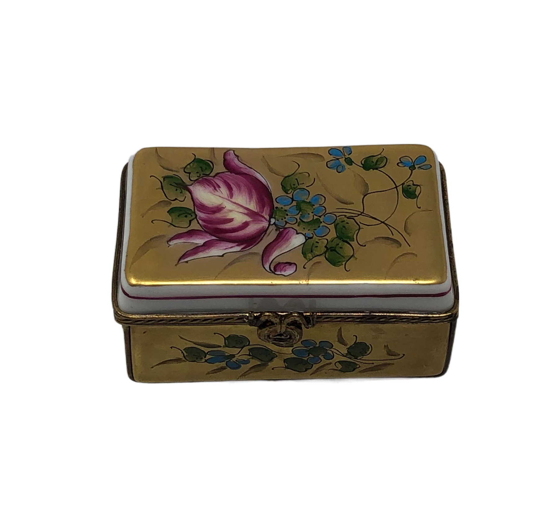 Floral Elegance - Limoges Box: Golden Treasure Adorned with Blue and Pink Flowers