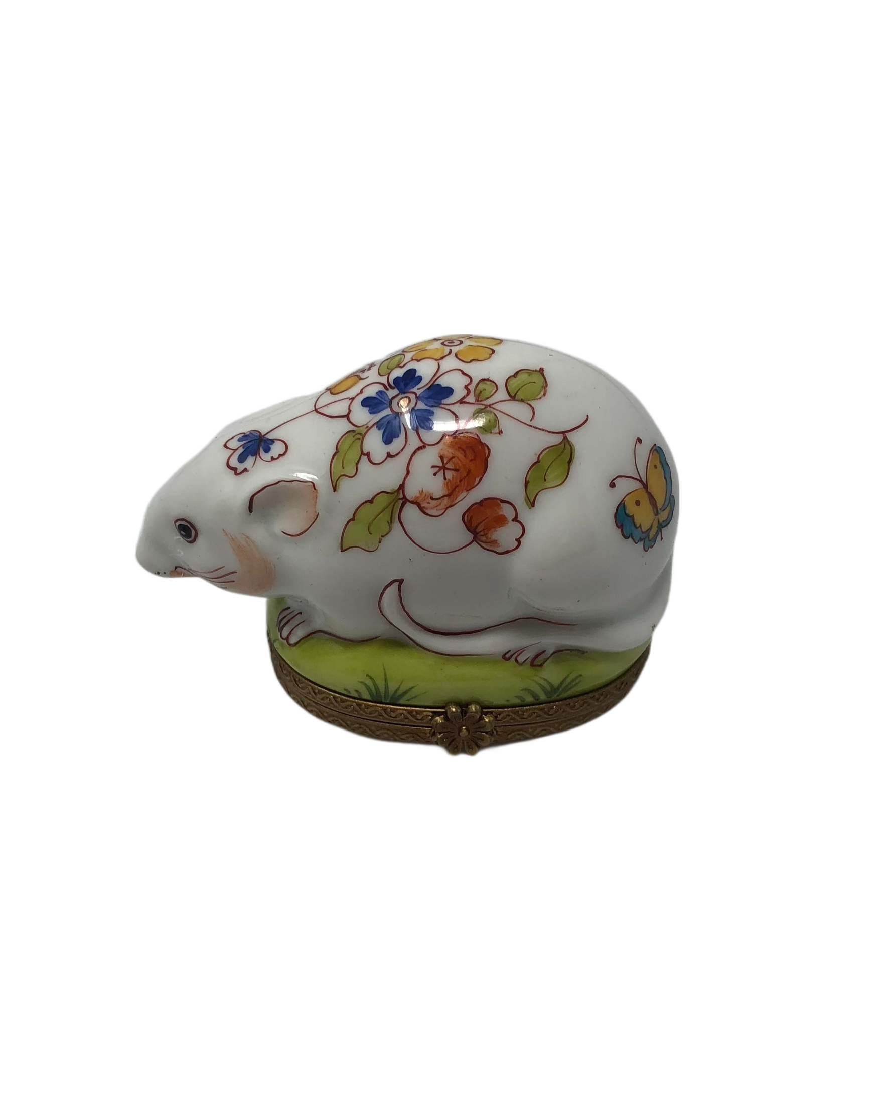 Embrace the enchanting world of our hand-painted Limoges Box featuring an adorable white rat adorned with delicate flowers on its back. This whimsical and unique piece showcases the artistry and attention to detail that Limoges boxes are renowned for. The charming white rat, with its intricate facial features and expressive eyes, exudes a sense of curiosity and playfulness. Its back is beautifully adorned with hand-painted blossoms, showcasing a burst of vibrant colors and intricate detailing. Lift the lid of this Limoges box to reveal a hidden compartment, perfect for storing tiny treasures or cherished mementos. Crafted with utmost care and precision, this Limoges box is a testament to the craftsmanship and artistry of the Limoges tradition. Whether displayed as a centerpiece or added to your collection, the Floral Whiskers Limoges Box is a delightful conversation starter and a true collector's item. Let this charming rat with its floral adornments add a touch of whimsy and elegance to your space. Cherish this unique piece and let it bring joy to your heart for years to come.