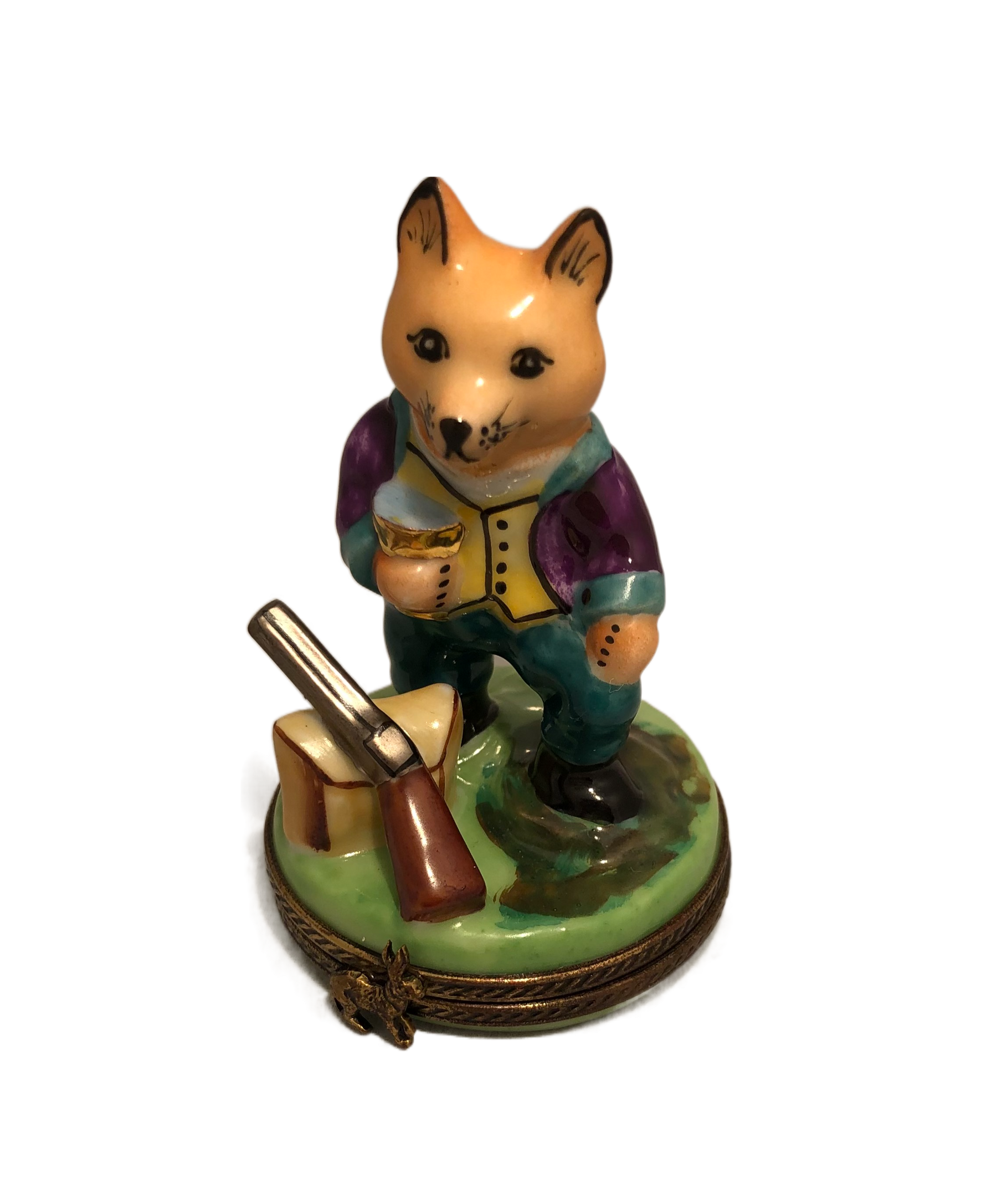 Unveil the peaceful interlude of a clever fox with our captivating Limoges Box. This intricately hand-painted masterpiece portrays a fox gracefully perched on a tree stump, taking a tranquil pause in its woodland escapades. Dressed in a regal purple jacket and a sunny yellow suit undershirt, the fox emanates a sense of sophistication and charm.