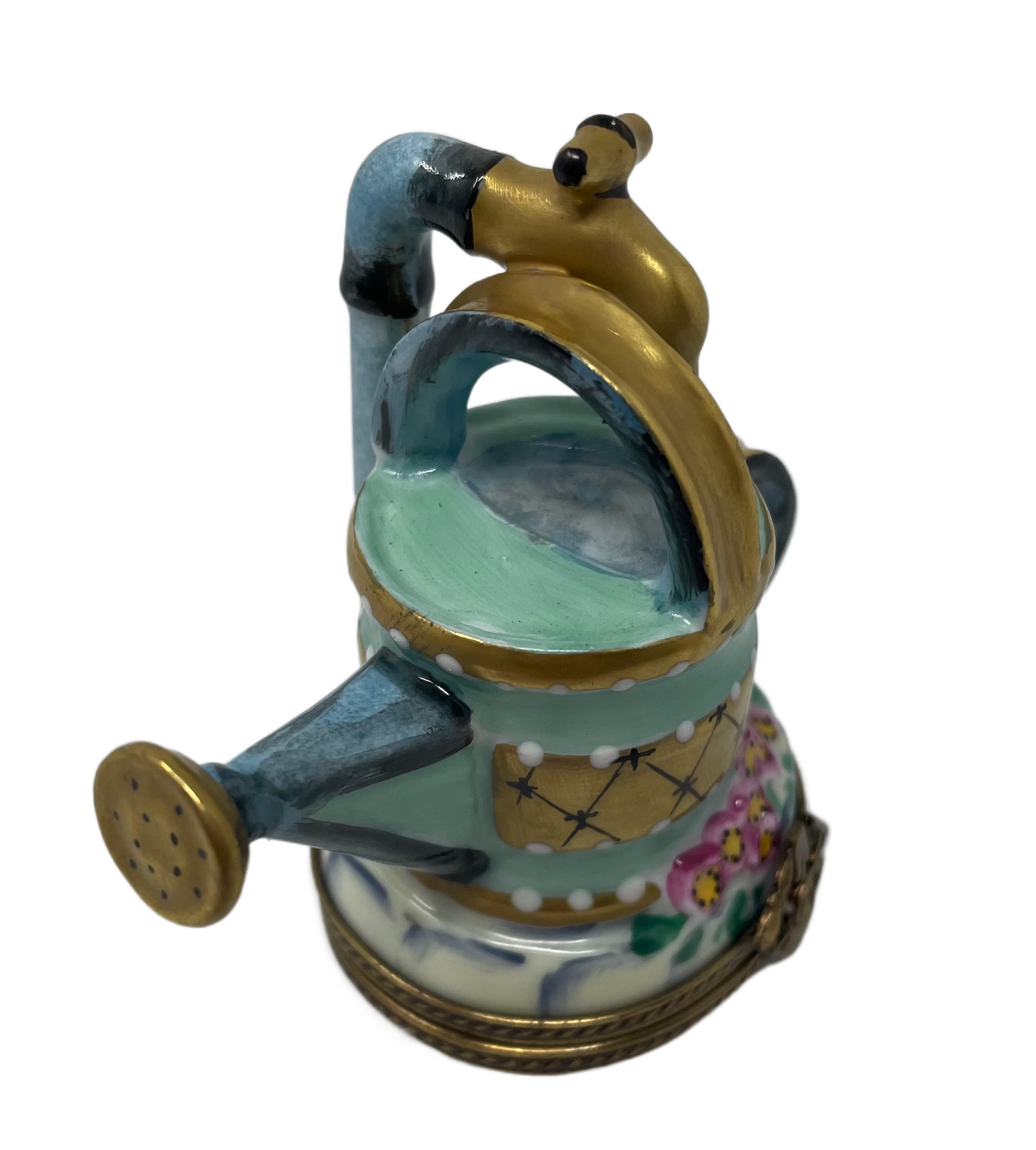 Garden Serenade: Limoges Box in the Shape of a Teal and Gold Watering Can