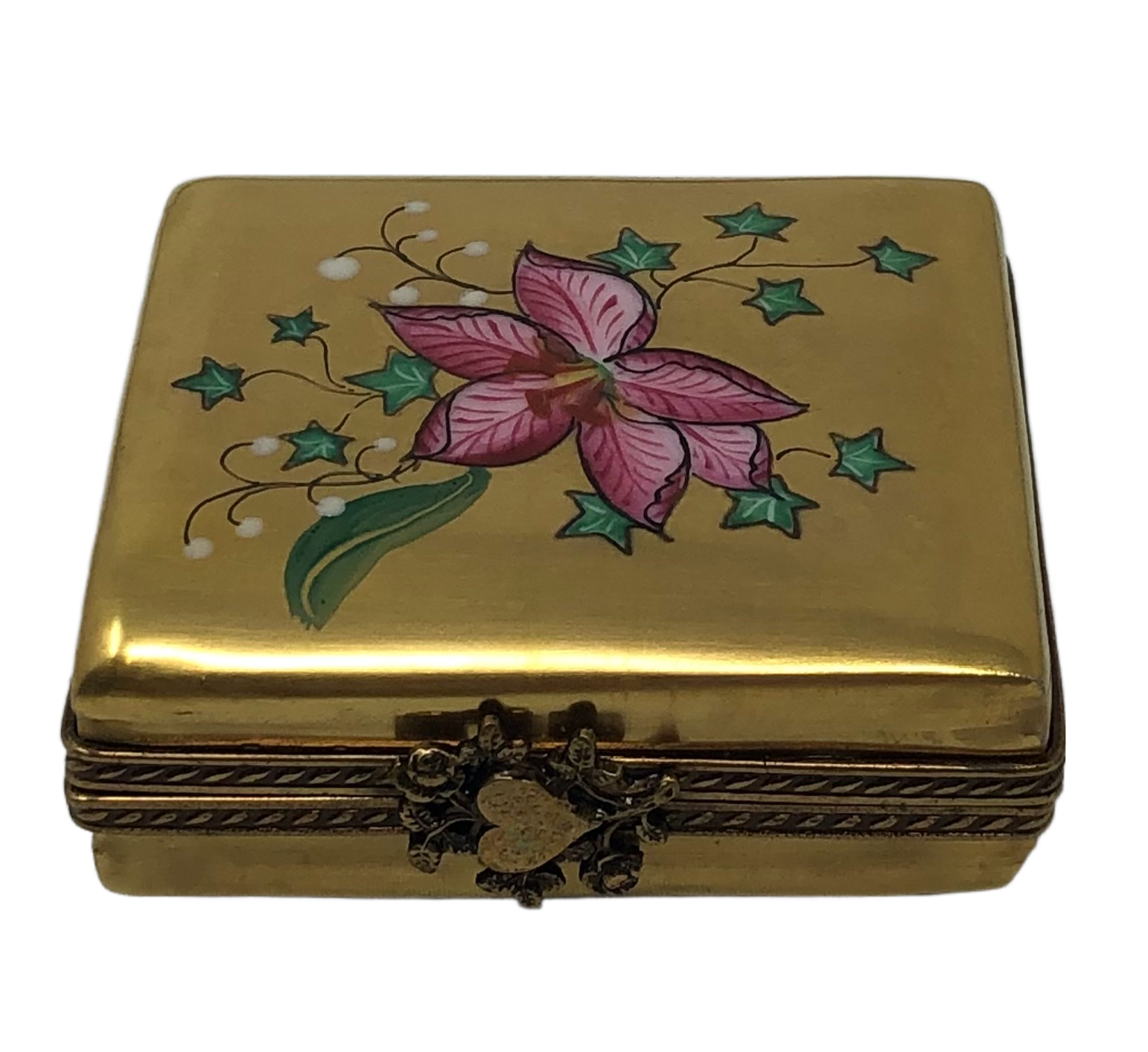 Gilded Petals: Golden Box with Pink Flower Limoges Box