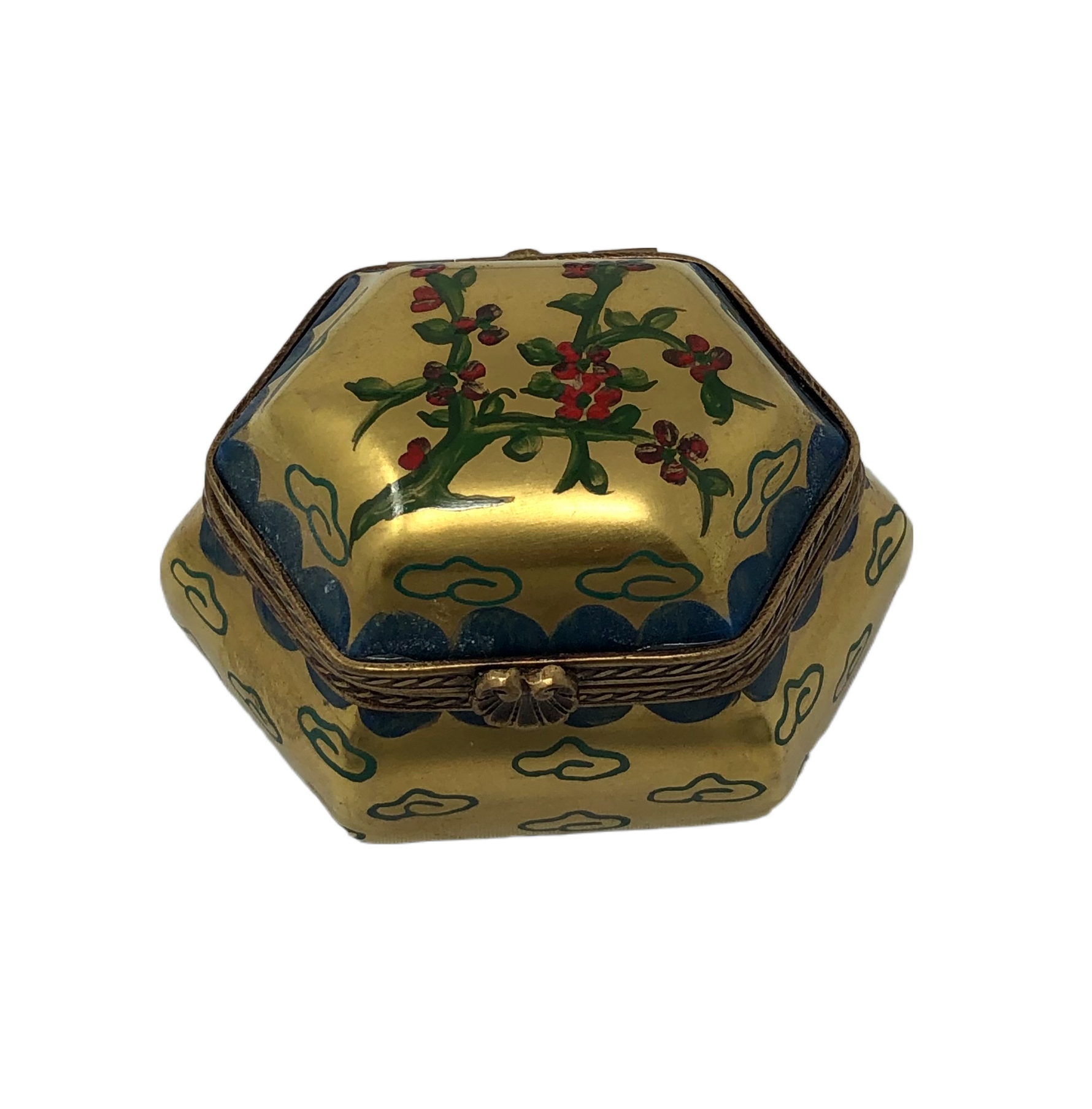 The hexagonal shape adds a touch of uniqueness to this Limoges Box, while the gold exterior exudes an air of opulence and sophistication. The blue accents beautifully complement the golden hues, creating a harmonious and eye-catching design.