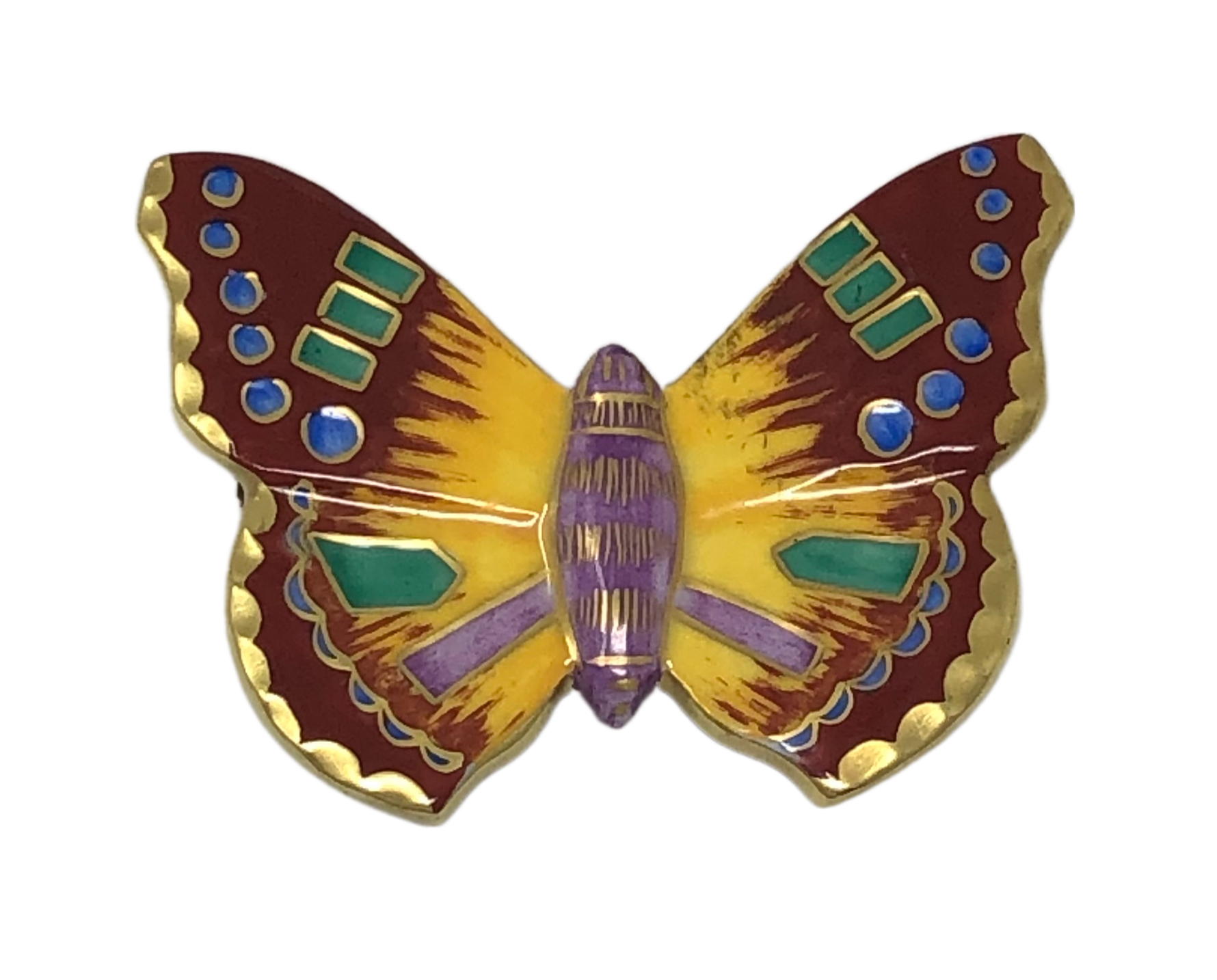 Embrace the captivating beauty of nature with our Golden-Tipped Red Winged Butterfly Limoges Box. This exquisite box is shaped like a magnificent butterfly, with vibrant red wings that gracefully span across its form. The tips of the wings are delicately adorned with shimmering golden accents, adding a touch of elegance and brilliance. The butterfly's body is painted in a rich shade of purple, showcasing its vibrant charm. Lift the hinged lid to reveal a secret compartment, perfect for storing your tiny treasures or cherished keepsakes. Handcrafted with meticulous detail, this Limoges box is a true testament to the artistry and craftsmanship of the finest porcelain artisans. Add a touch of natural splendor to your collection with this enchanting butterfly masterpiece.