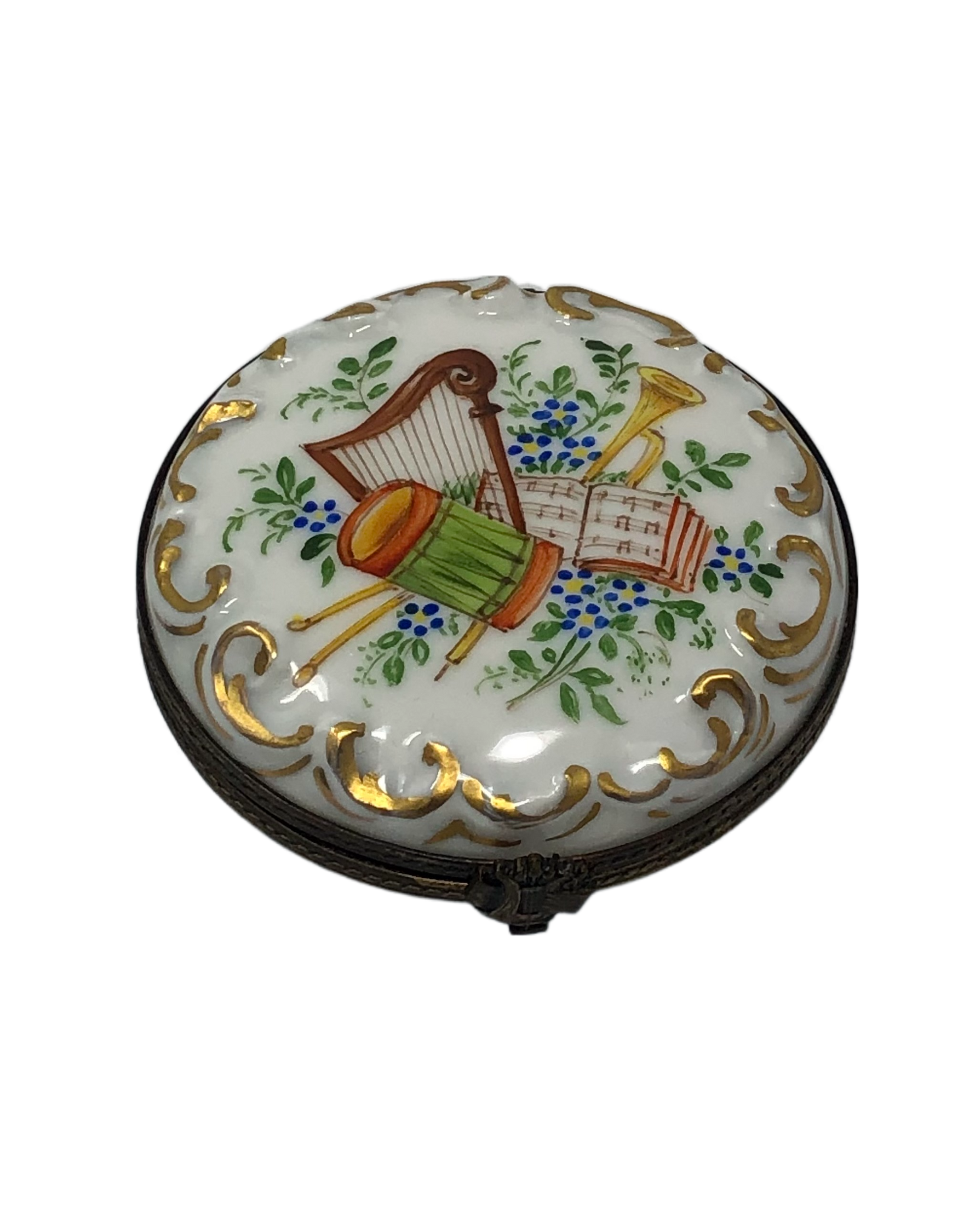 The white circular shape of the Limoges Box provides a clean canvas for the intricate depiction of musical instruments. From the majestic drum to the elegant harp and the resounding trumpet, the collage showcases a variety of instruments, each with its own unique charm and significance.