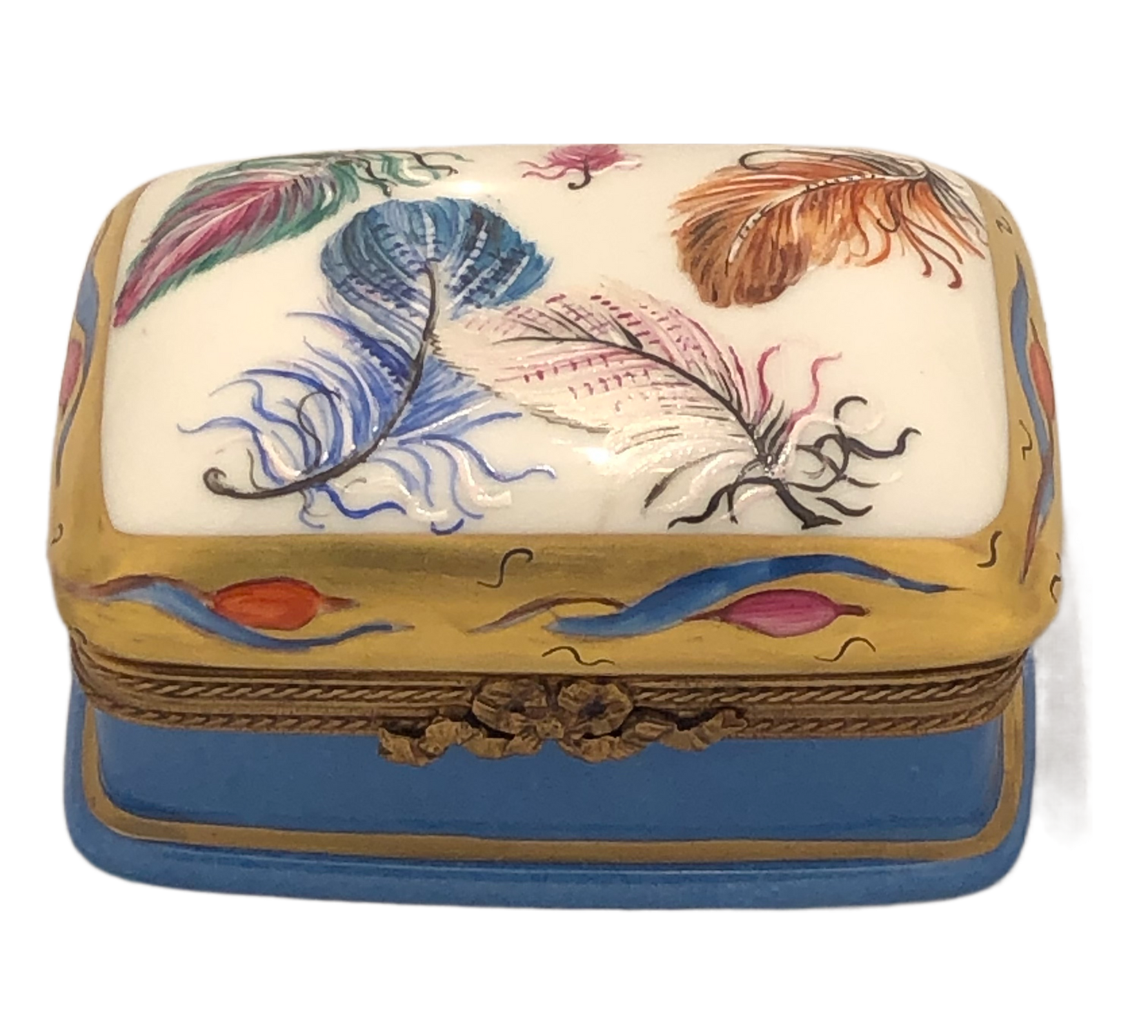 Discover a symphony of elegance with our hand-painted Limoges feathered treasure box. This rectangular box features a captivating blue base with a lustrous gold trim, exuding regal charm. Adorning the lid are four meticulously hand-painted feathers in vibrant blue, soft pink, rich brown, and striking green, while a smaller pink feather adds a touch of whimsy. Lift the hinged lid to reveal a spacious compartment, perfect for storing cherished trinkets. Display this exquisite Limoges treasure box as a centerpiece and indulge in the harmony of colors and delicate craftsmanship.
