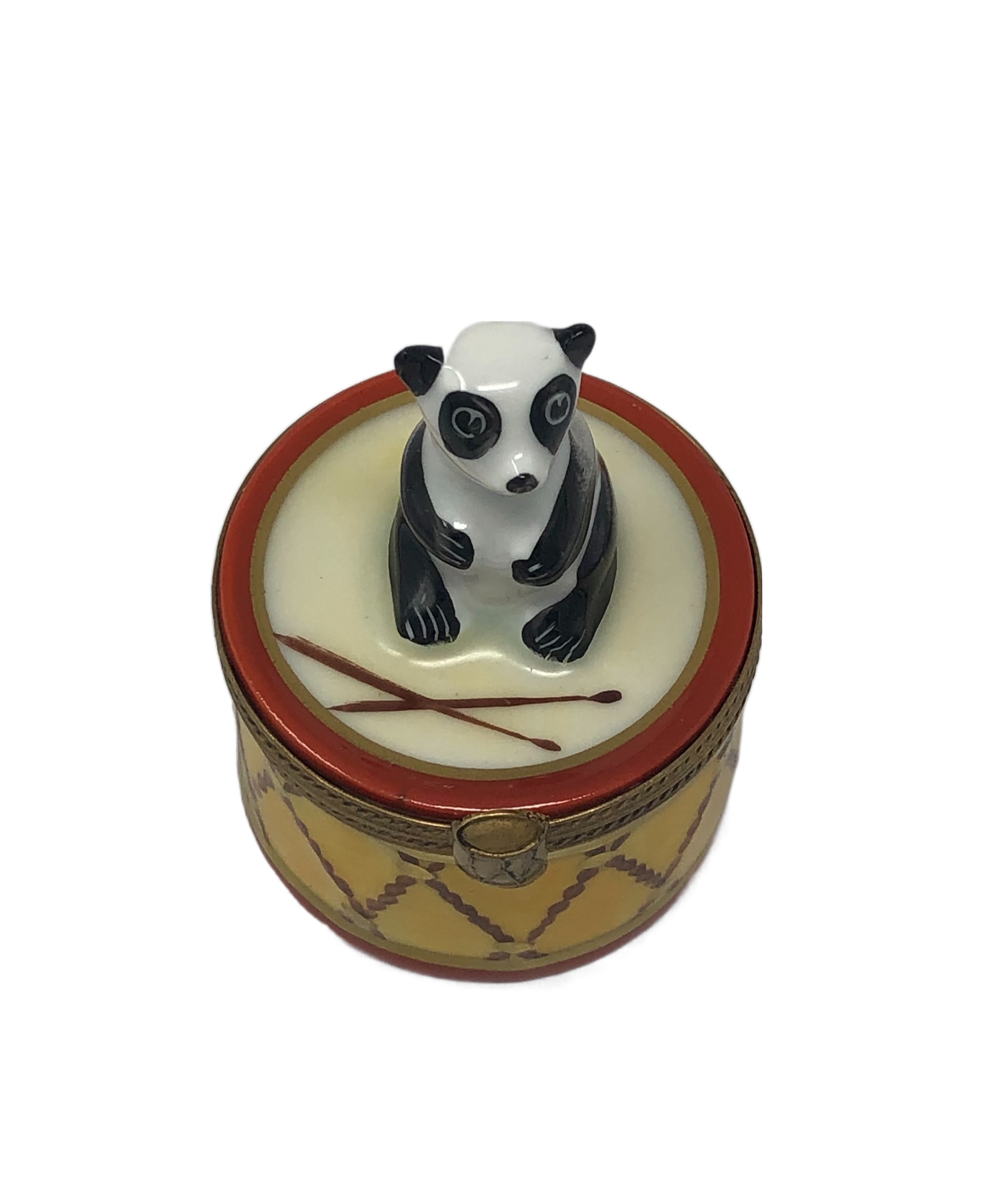 Discover the whimsical charm of our Panda Bear on Yellow Snare Drum Limoges Box. This delightful collectible showcases a lovable panda bear sitting atop a vibrant yellow snare drum. The intricate details bring the panda to life, with its black and white fur meticulously hand-painted to perfection. The yellow snare drum adds a pop of color and fun to the design, complete with intricate drumhead detailing. Lift the hinged lid to reveal a hidden compartment, perfect for storing small treasures or trinkets. Crafted with exquisite artistry and attention to detail, this Limoges box is a testament to the skill and craftsmanship of our talented artisans. Add a touch of playfulness to your collection with this adorable Panda Bear on Yellow Snare Drum Limoges Box.
