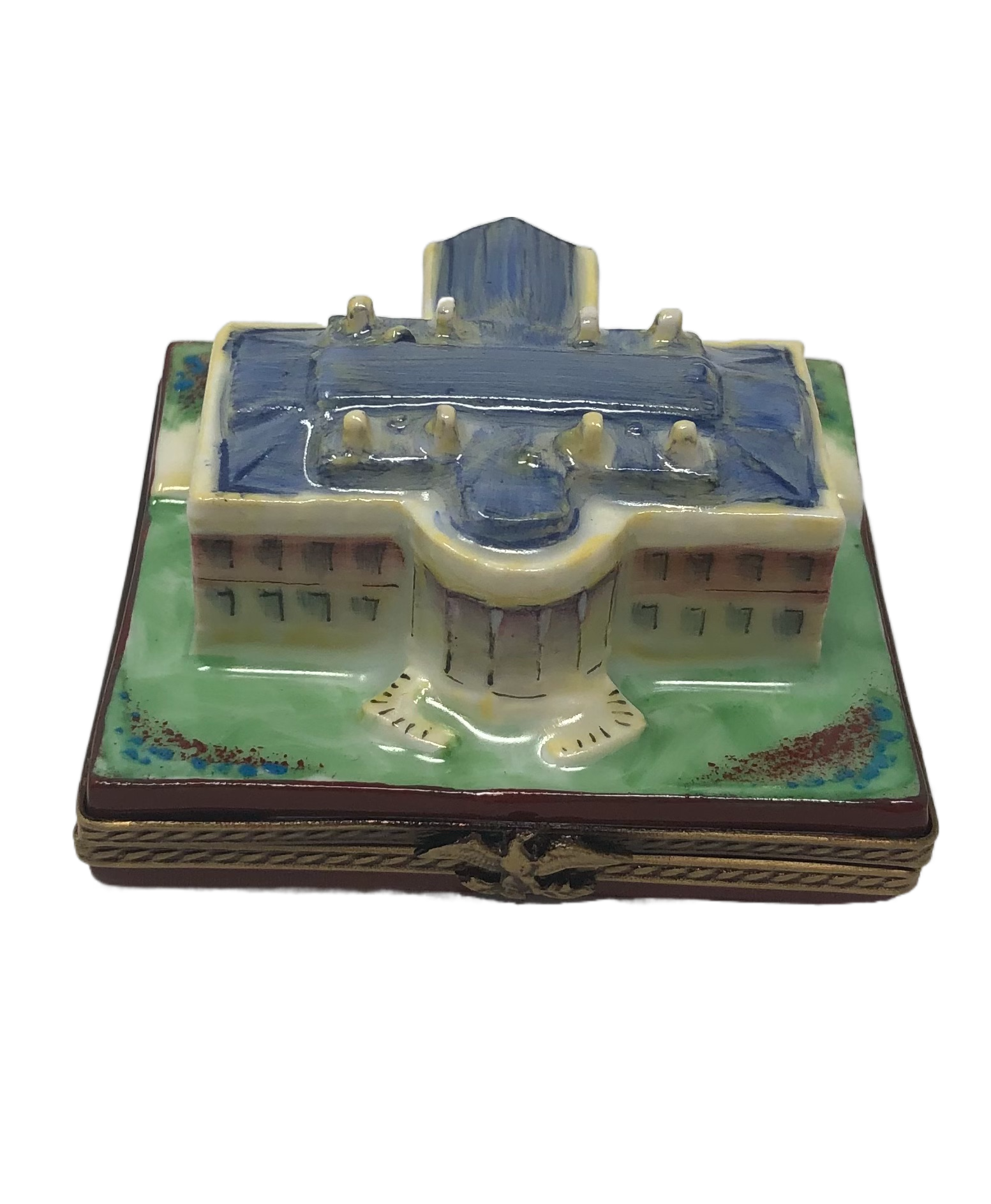 Introducing our exquisite Limoges Box inspired by the iconic White House! Crafted with meticulous attention to detail, this collectible treasure perfectly captures the grandeur and elegance of the historic residence. From the stately columns and intricately designed windows to the iconic portico and impressive dome, every architectural feature of the White House is faithfully represented in this miniature replica. Lift the hinged roof to reveal a hidden compartment, ideal for storing tiny keepsakes or cherished mementos. Hand-painted with utmost precision, the vibrant colors and intricate details bring this miniature White House to life. It's a must-have for history enthusiasts, collectors, or anyone with a deep appreciation for the rich heritage and timeless beauty of this esteemed landmark. Display it proudly as a centerpiece in your collection or gift it to a fellow admirer of American history. Our White House Limoges Box is a true testament to the artistry and craftsmanship of Limoges porcelain, making it a cherished addition to any collection.