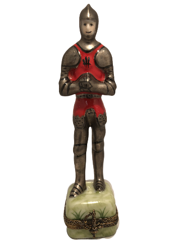 Behold the grandeur and valor of our hand-painted Limoges knight in shining armor trinket box - a majestic representation of medieval chivalry. This extraordinary piece is meticulously crafted to showcase the heroic figure of a knight, adorned in gleaming armor that exudes a timeless aura of courage and nobility.