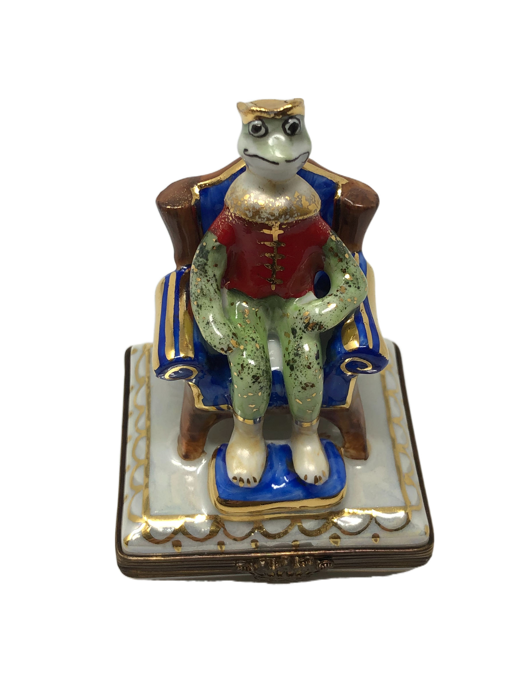 Behold the whimsical charm of our Frog King Limoges Box, featuring a delightful frog dressed as a king, perched upon a majestic blue throne. This unique collectible showcases the artistry of Limoges porcelain, meticulously crafted to capture every intricate detail.