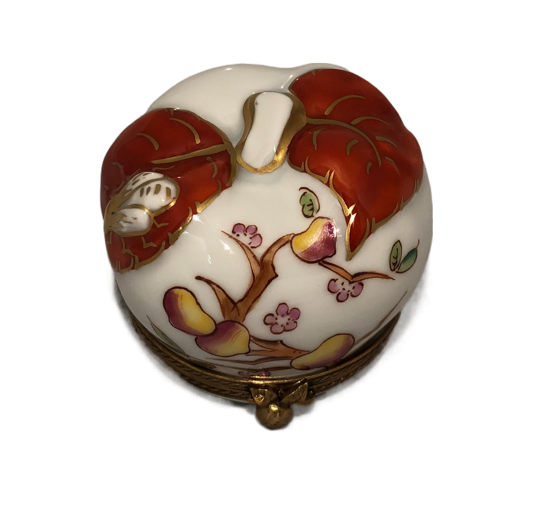 Indulge in the allure of fresh fruits with our exquisite Limoges Box in the shape of a white peach. This charming piece captures the essence of nature's bounty, with delicate hand-painted details showcasing the luscious beauty of a ripe peach. The smooth, porcelain surface of the peach-shaped box is adorned with vibrant red leaves, adding a touch of color and visual appeal.