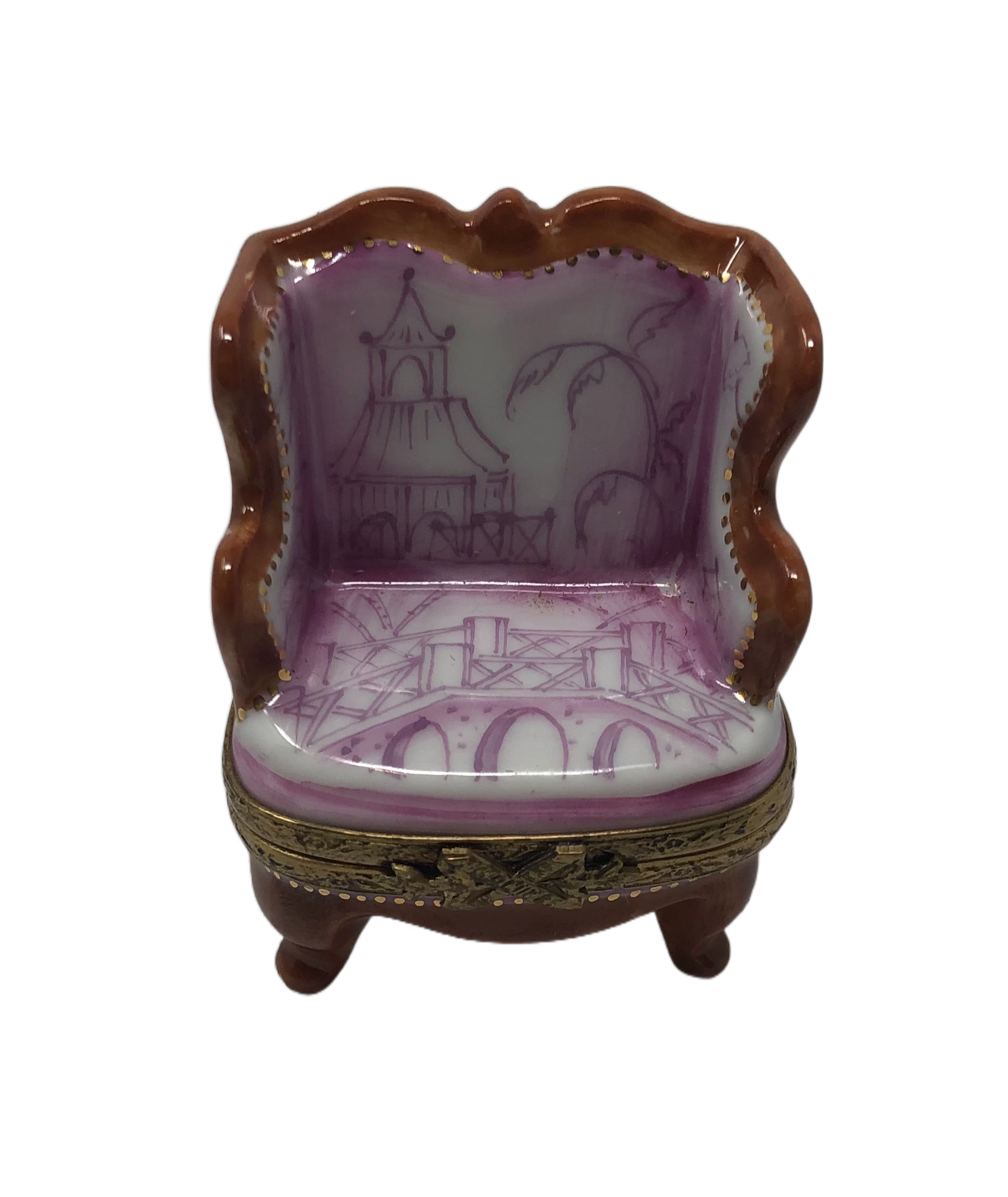 Indulge in a moment of tranquility with our Wooded Chair with Knitted Bridge Scene Limoges Box. This charming Limoges Box is shaped like a cozy wooden chair, adorned with exquisite pink and white upholstery that adds a touch of elegance. The seat of the chair features a hand-knitted scene depicting a lovely bridge, showcasing meticulous attention to detail and craftsmanship. The hinged opening of the Limoges Box reveals a hidden compartment, perfect for storing small treasures or jewelry. Whether displayed on a shelf or gifted to a loved one, this Limoges Box serves as a reminder of the beauty and serenity found in nature. Immerse yourself in a peaceful ambiance with our Wooded Chair with Knitted Bridge Scene Limoges Box, a delightful addition to any collection or home decor.