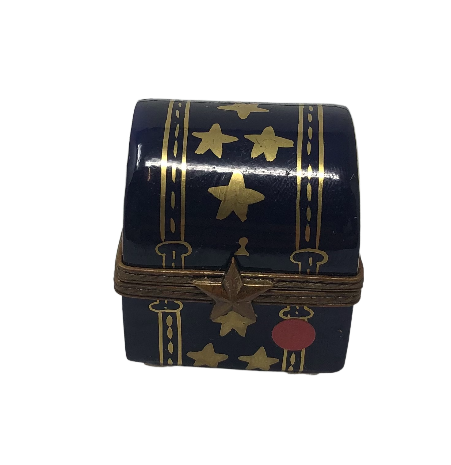 Discover the magic of the night sky with our Midnight Blue Chest Limoges Box. Crafted in the shape of a chest, this exquisite Limoges Box is bathed in a rich midnight blue hue, reminiscent of the enchanting starry night. The chest is adorned with shimmering golden stars, adding a touch of celestial charm. With a hinged lid that opens to reveal a hidden compartment, this Limoges Box is perfect for storing small keepsakes or jewelry. Whether displayed as a decorative piece or gifted to a loved one, the Midnight Blue Chest Limoges Box is a treasure in itself. Embrace the beauty of the night sky and add a touch of elegance to your collection with this captivating Limoges Box.