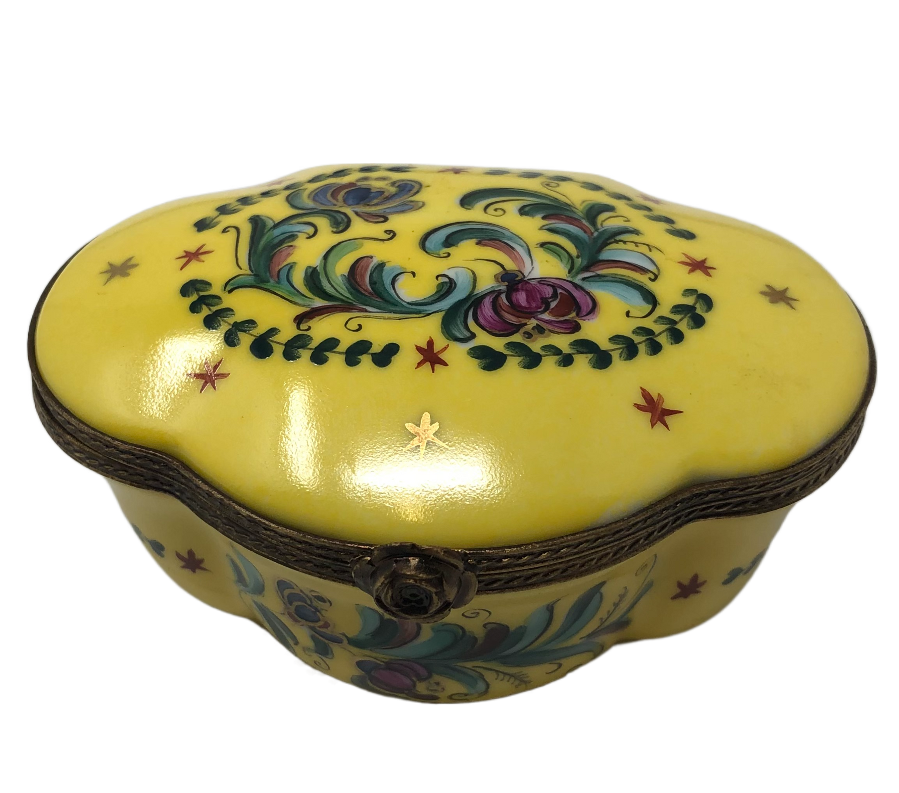 Indulge in the beauty of nature with our Sunflower Serenade Limoges Box. Crafted in a unique organic shape, this exquisite yellow box is adorned with delicate floral accents, reminiscent of a vibrant sunflower garden in full bloom. The intricate hand-painted details bring the flowers to life, showcasing the artistry and craftsmanship of Limoges porcelain. Lift the lid to reveal a hidden compartment, perfect for storing small treasures or cherished keepsakes. The radiant yellow hue exudes warmth and joy, while the organic shape adds a touch of natural elegance. Whether displayed as a centerpiece or gifted to a loved one, our Sunflower Serenade Limoges Box is a true celebration of nature's beauty and a symbol of joy and renewal. Embrace the enchanting allure of sunflowers with this exquisite piece, a delightful addition to any collection.