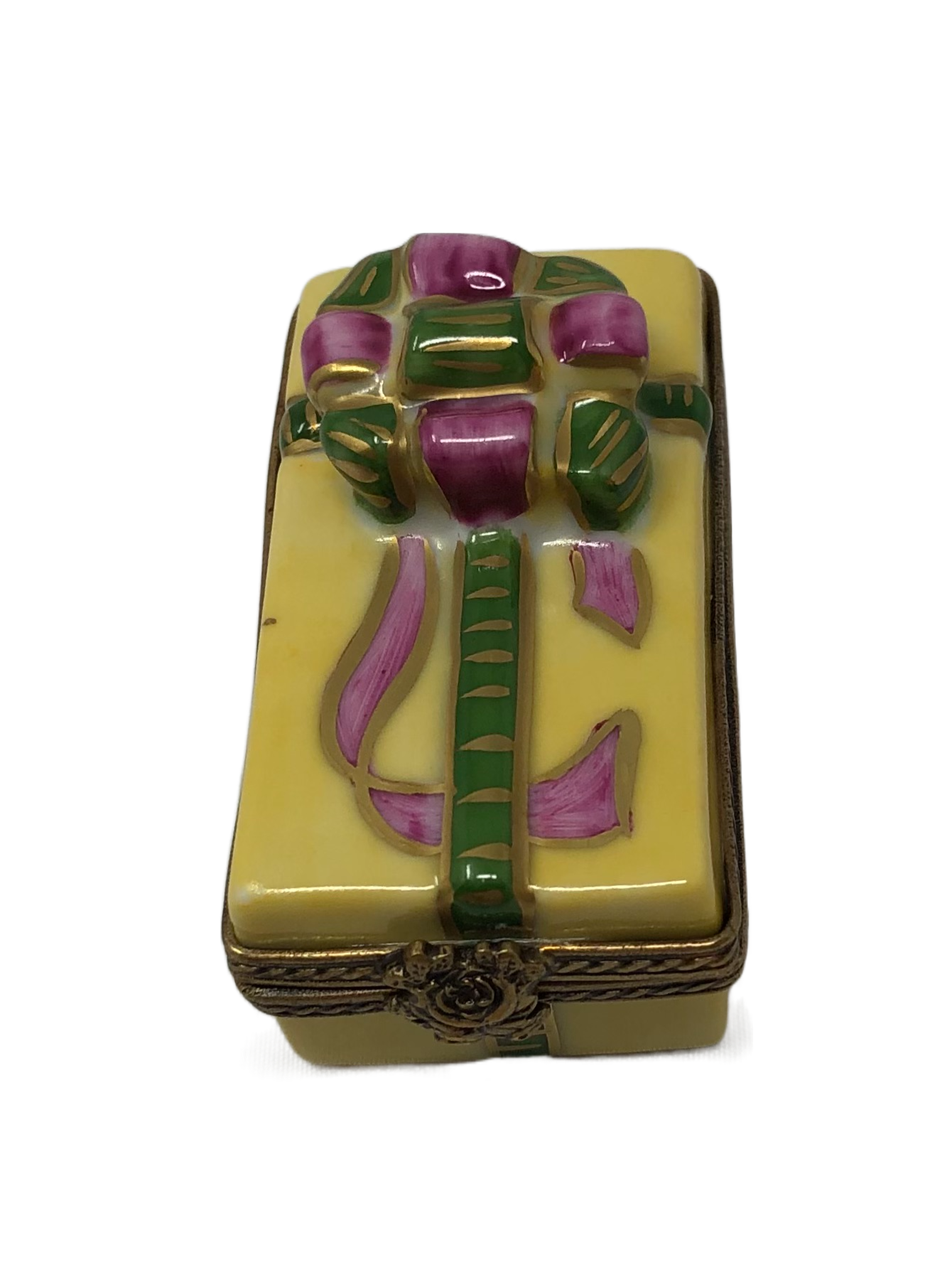 Elevate your wine experience with our exquisite Sunny Soirée Limoges Box, a stunning tribute to the art of wine and craftsmanship. This Limoges Box takes the shape of a charming yellow wine box, meticulously hand-painted with intricate details that capture the essence of sophistication and celebration. The box features a delightful green and pink bow, adding a touch of elegance to its vibrant design. Crafted from fine porcelain, this collectible Limoges Box opens to reveal a hidden compartment, perfect for storing small treasures or even a special memento. Display it proudly in your wine cabinet, use it as a unique gift box, or simply let it adorn your home with its undeniable charm. Whether you're a wine enthusiast, a collector of fine artistry, or someone who appreciates the finer things in life, the Sunny Soirée Limoges Box is a must-have addition to your collection. Indulge in the beauty and allure of this exquisite Limoges Box, and let it transport you to a world of elegance and refinement.