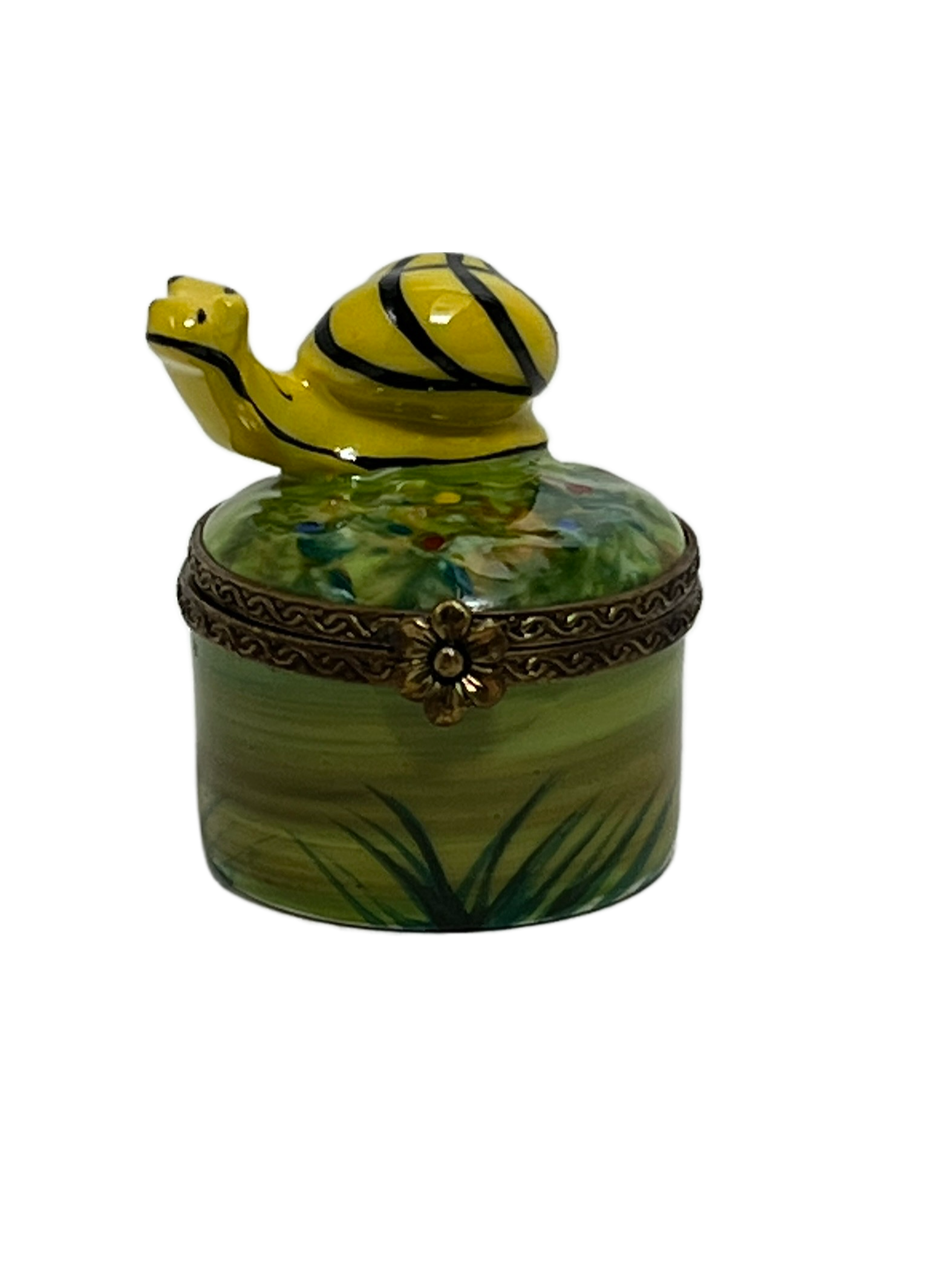 Sunny Trails: Yellow Snail on a Glass Circular Limoges Box