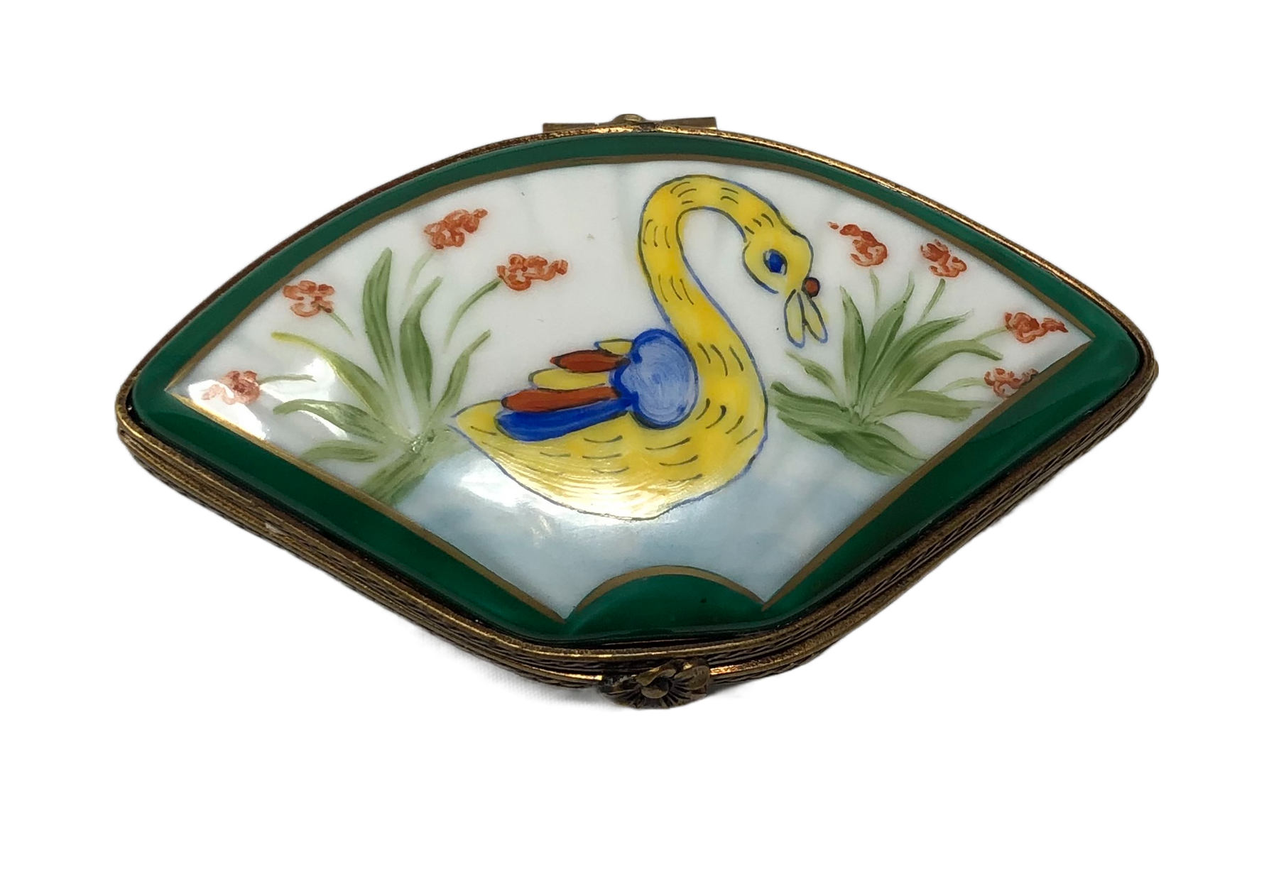 Swan Serenade: Artistic Fan-Shaped Limoges Box