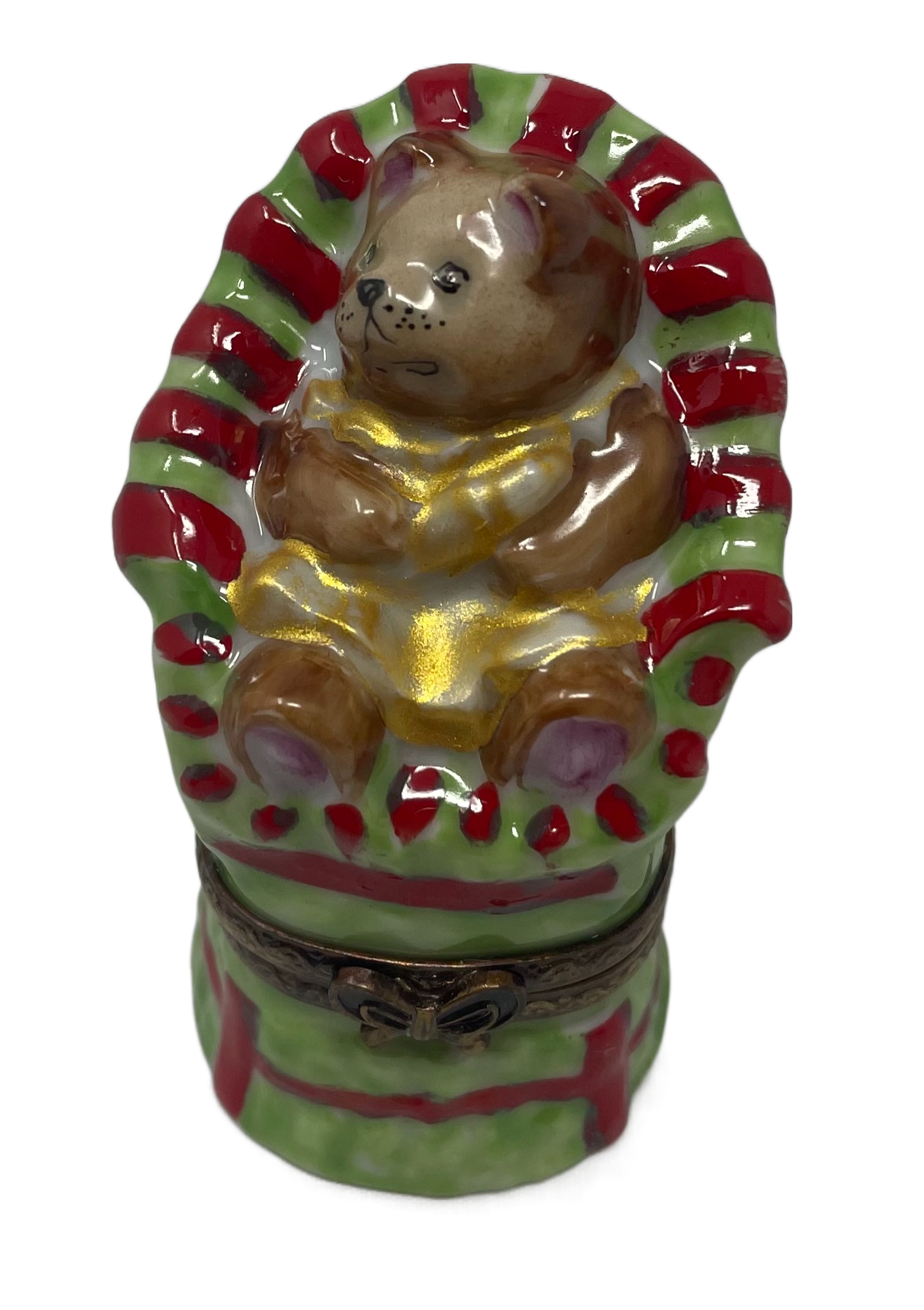 Sweet Moments: Baby Teddy Bear in Green and Red High Chair Limoges Box