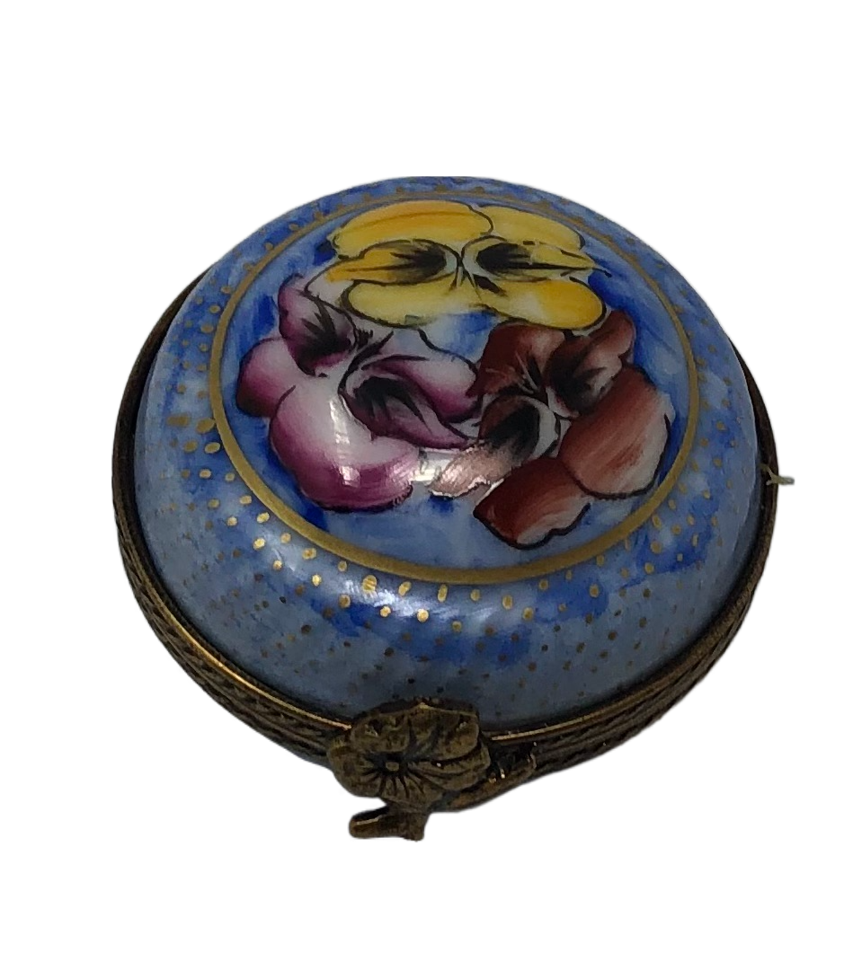 Tranquil Blooms: Blue Circular Limoges Box with Three Vibrant Flowers