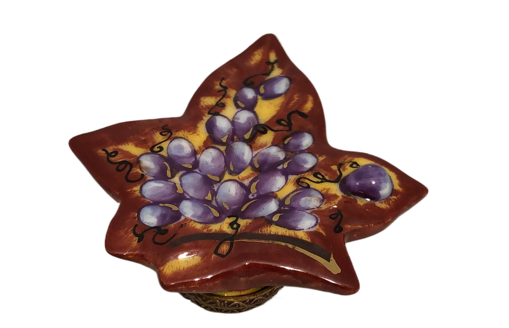 Display this exquisite piece as a collector's item or use it as a cherished trinket box to hold your most precious keepsakes. The combination of the vibrant red leaf and the intricate grape cluster design makes this Limoges Box a standout piece in any collection. Immerse yourself in the world of vineyards and fine wines with this stunning hand-painted treasure.