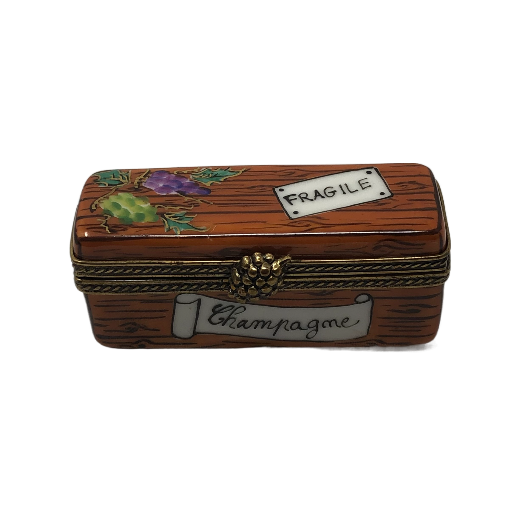 Raise a toast to elegance and sophistication with our exquisite Champagne Limoges Box. Crafted in the shape of a charming champagne box, this hand-painted piece showcases beautifully detailed green and purple grapes, capturing the essence of a vineyard. The word "Fragile" adds a touch of authenticity to the design, while the word "Champagne" on the side exudes celebration and luxury. Whether you're a wine enthusiast or a Limoges collector, this unique piece is a testament to craftsmanship and refinement. Cherish the joy of indulgence and add a touch of vineyard charm to your collection with this delightful Limoges Box.