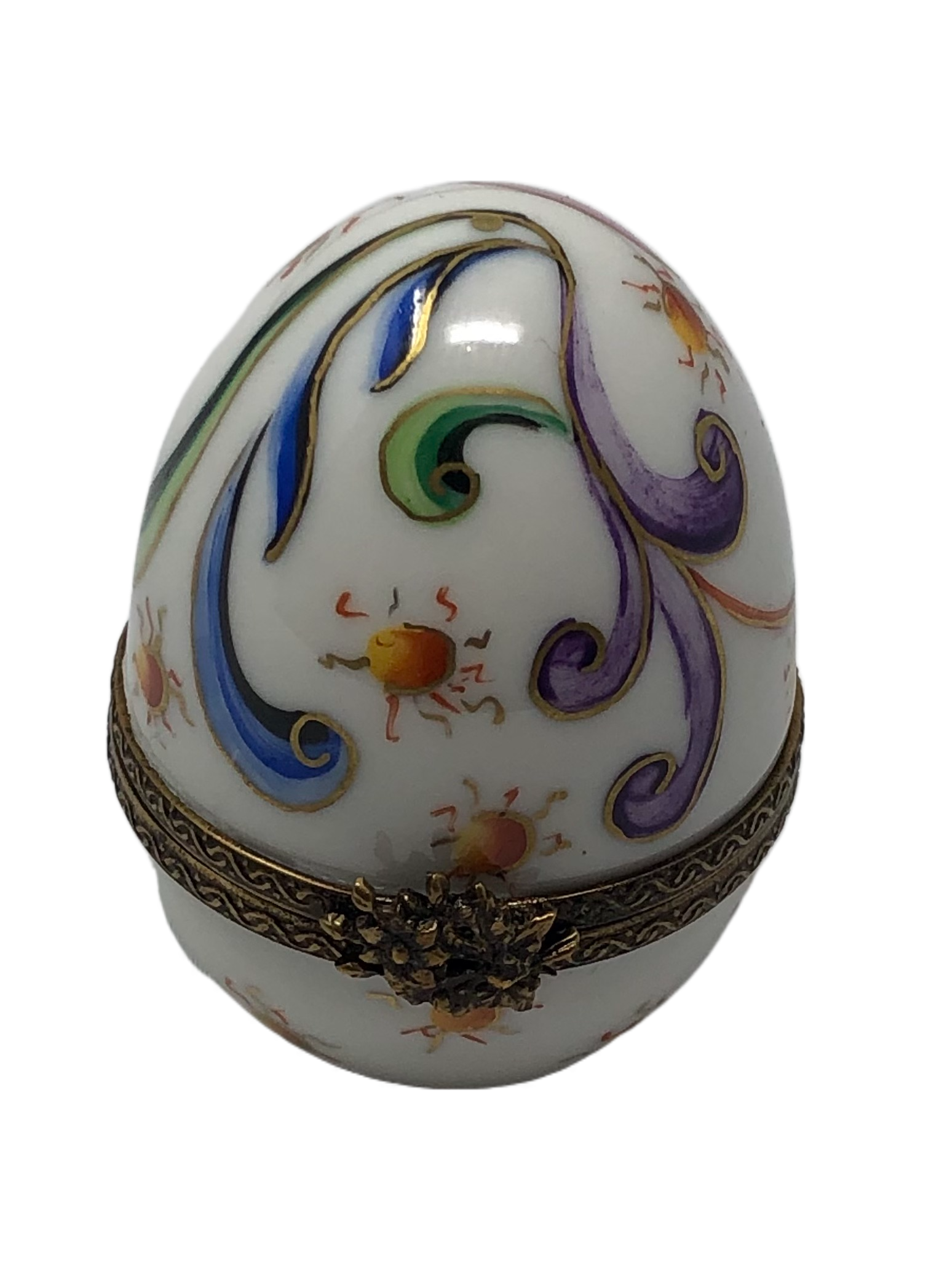 Whimsical Delight: White Egg Limoges Box with Vibrant Filigree