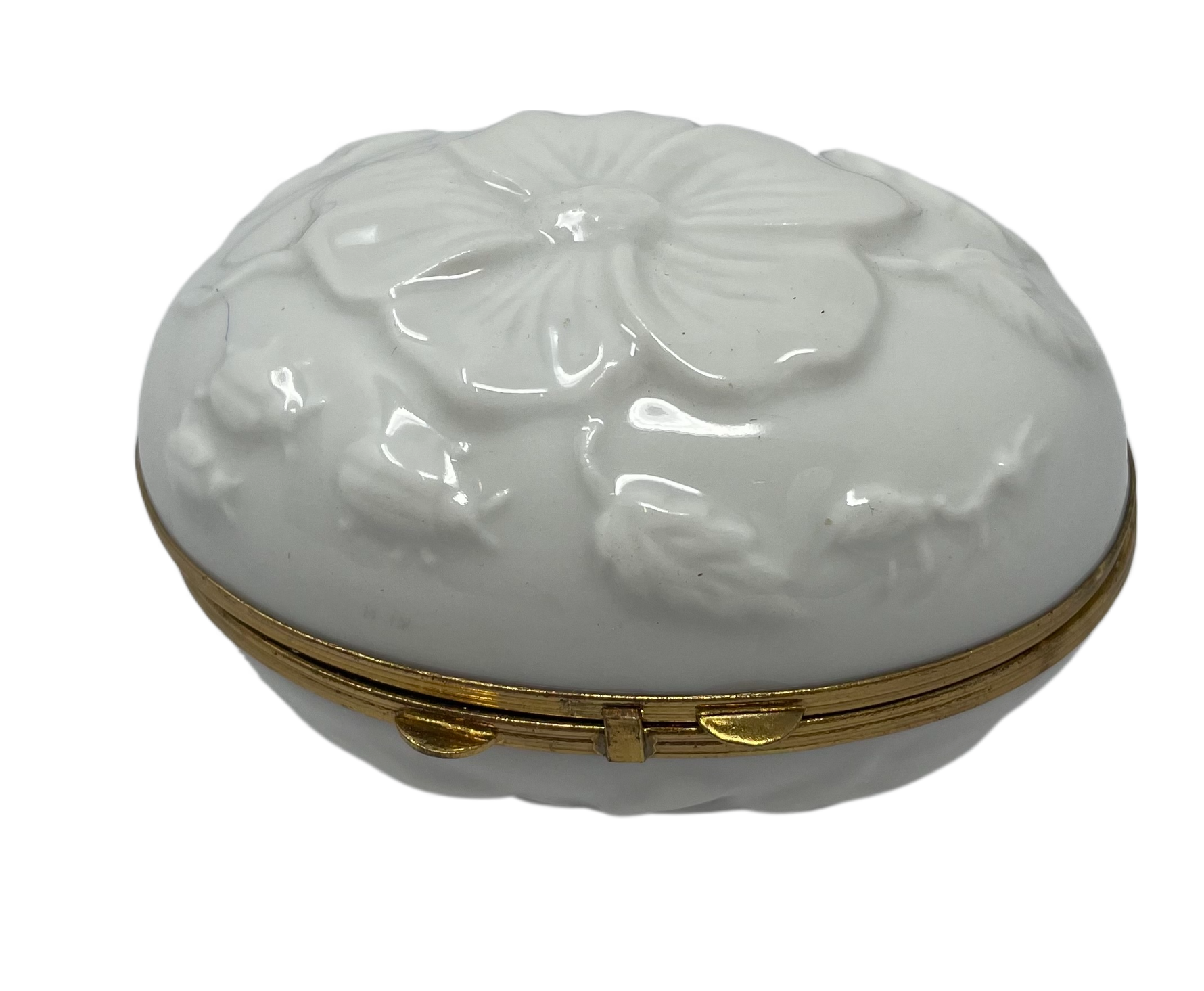 Whimsical Garden Whispers: Limoges Box in the Shape of an All White Floral and Bugs Scene